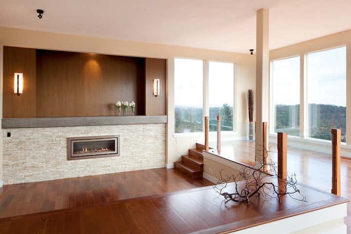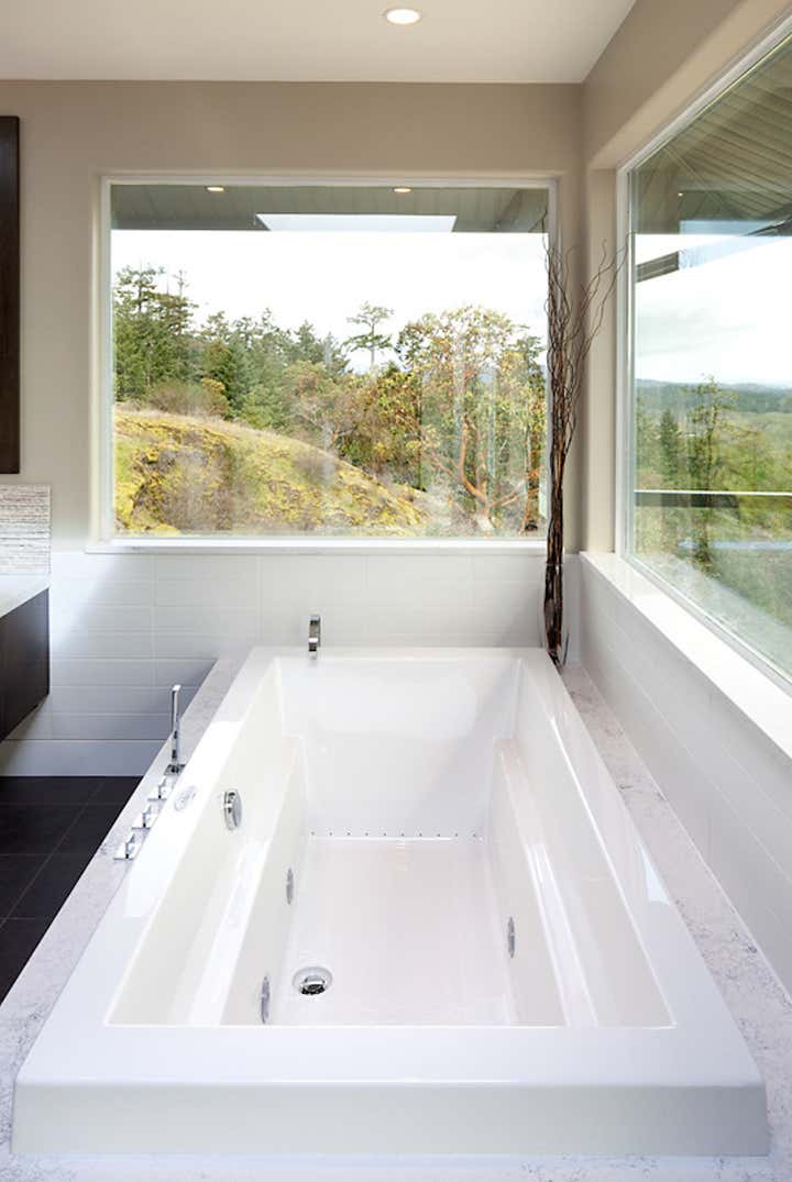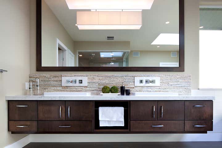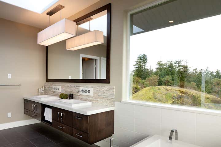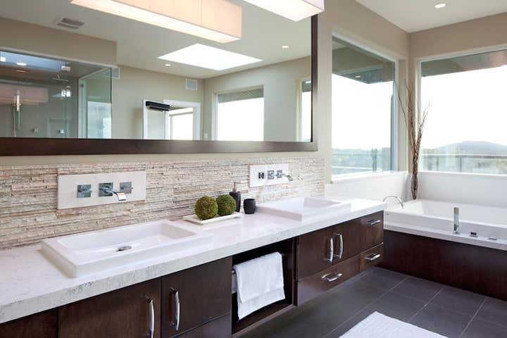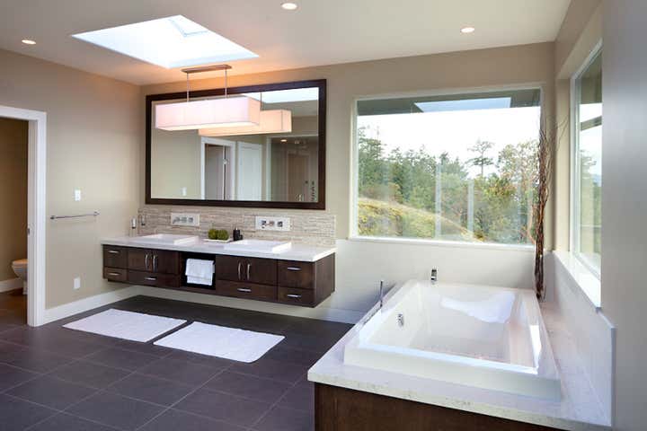 Arabella has a contemporary bathroom with dark espresso cabinetry and a white sunken bath.