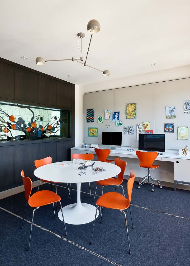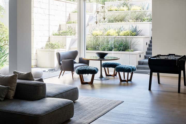 This 14,000 square foot home was designed for a high-profile alternative energy CEO and his young, active family. The clients have a European sensibility and requested unique, custom pieces throughout the three-level main home and pool house. The design is centered more on texture and form than color given that they had a strong preference for quiet, beautiful furnishings.