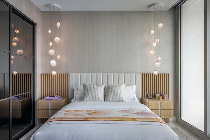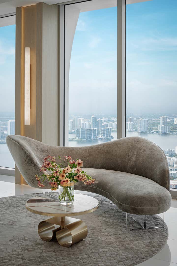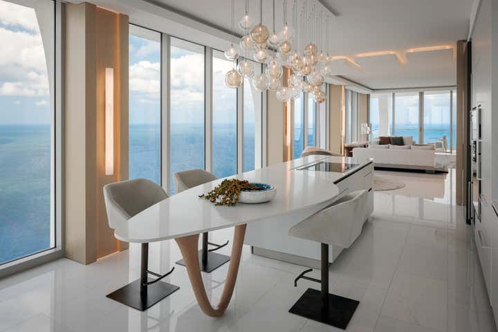 Designed for a family as their vacation home in Miami, this Jade Signature residence by Tamara Feldman takes a modern approach to beachfront living. The interiors are a reflection of the client’s love for sleek finishes, statement art, and unexpected design moments. From the cantilevered console in archipelago stone in the foyer to the marble wall by ARCA in the living, each space is expertly curated.