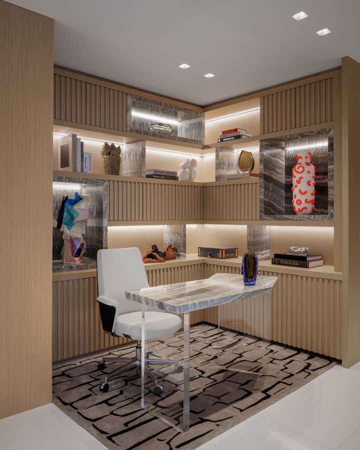 The main entrance features high-gloss lacquered white-fluted wood that wraps the inner foyers concealing three doors, among them the powder room, which is a jewel box of a space. Indirect lighting, oak wood paneling, a Van Gogh granite sink with rose gold faucet by Franz Biegener create an everlasting impression. With an open plan layout the design concept uniquely connects each area through the thoughtful transition of colors and materials.