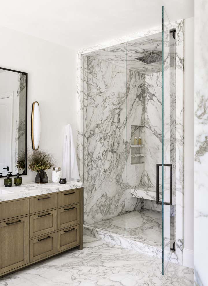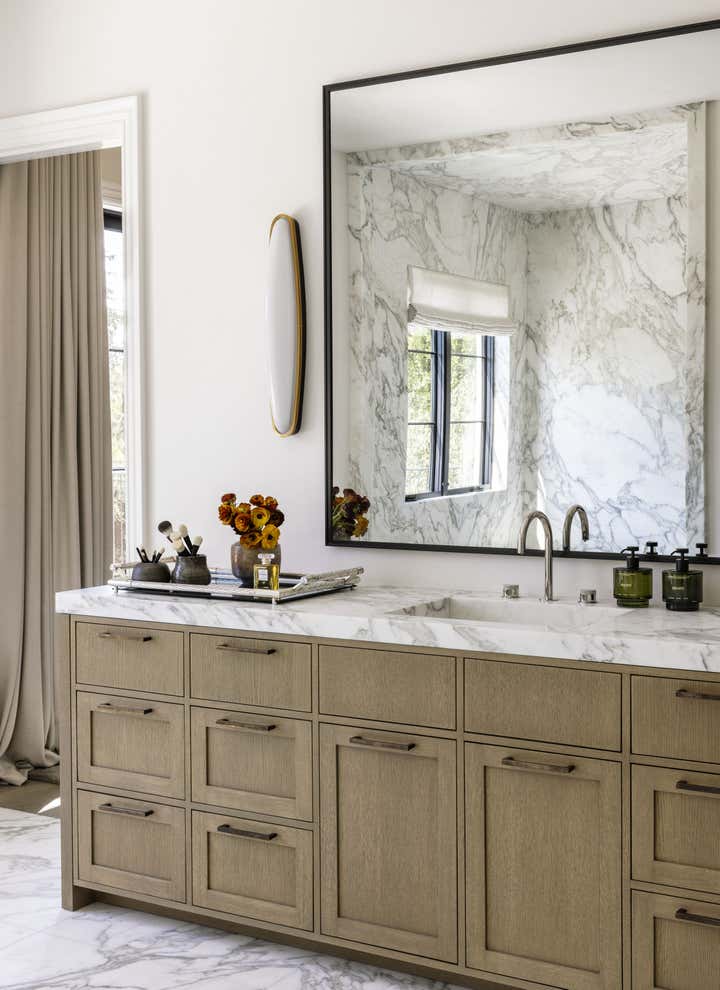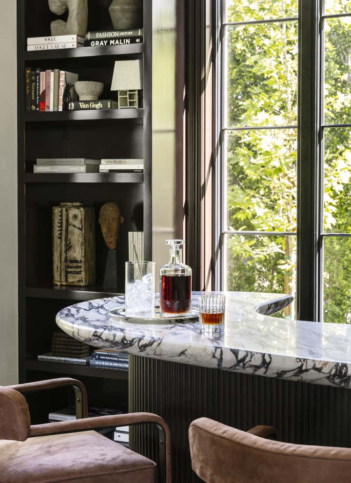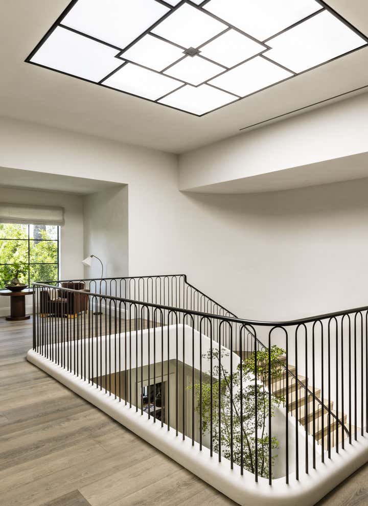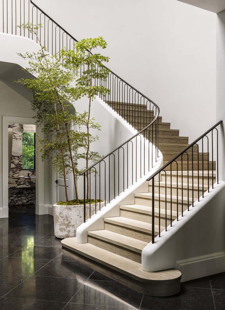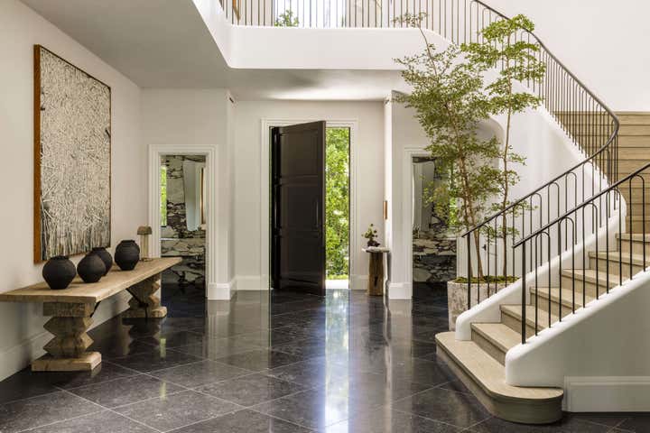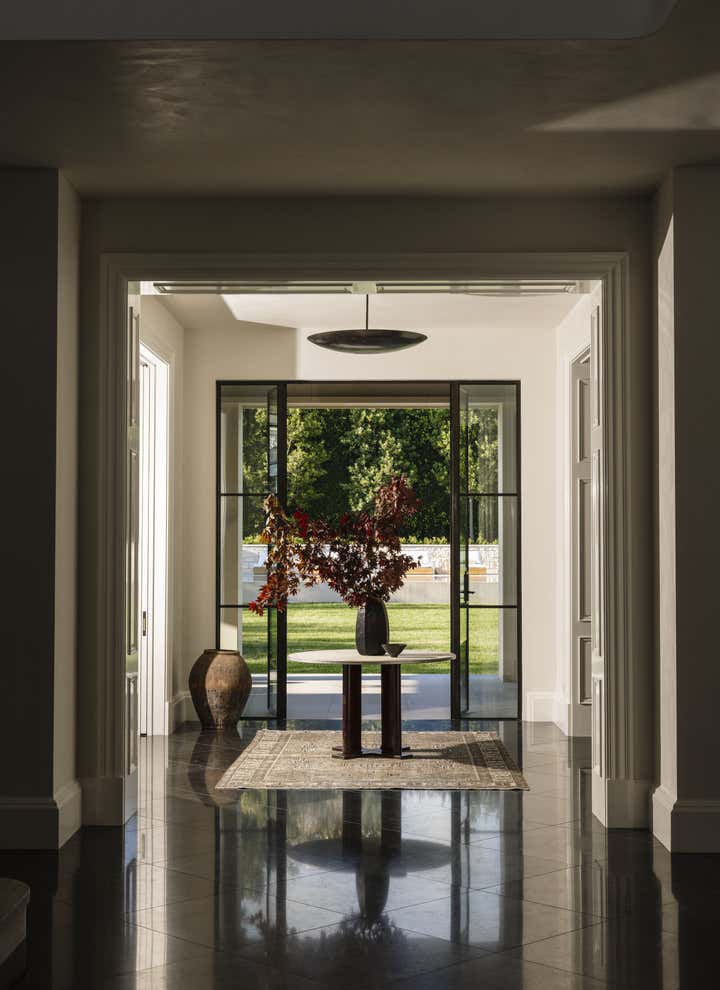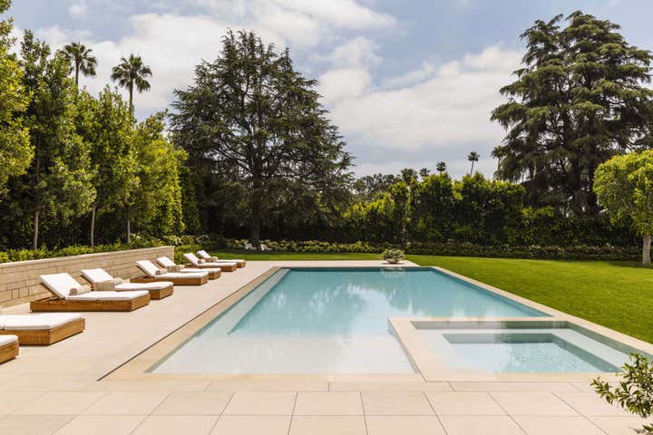 Glamour and comfort are the touchstones of this expansive remodel of an Old Hollywood home. Clint Nicholas Design added soul and sophistication with numerous subtle moves: an extra swoosh in the staircase, an edit of outmoded ornamentation, a buttery coating of lime plaster, translucent new skylights to let in diffused LA sunlight, glistening granite and marble surfaces. This house in a Beverly Hills canyon is opulent yet welcoming, cozy yet airy as it opens into the garden and pool area, melding architecture with nature. This place is so calming you simply have to surrender and go with the flow.