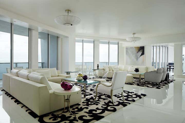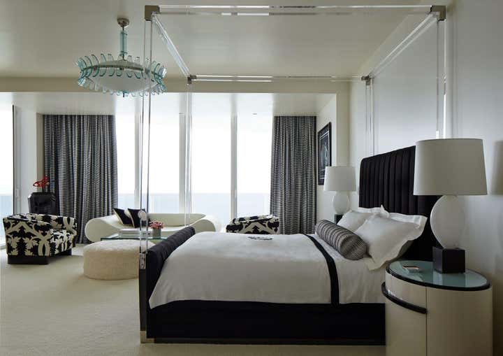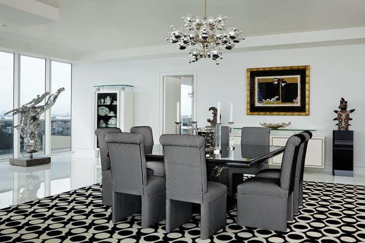 Highly polished surfaces and luxurious textiles create a bight environment in black and white. In the living room dual seating areas in white chenille, velvet, suede and fur add warmth to Lucite and chrome, with black and white wool arabesque patterned rugs that sit over white porcelain floor tiles. Black and white velvet stripe chairs around the black lacquer dining table sit on top of on optic patterned wool rug which are all reflected in a mercury glass bubble chandelier. A Lucite canopy bed in the master bedroom is upholstered in black suede on lush white shag carpet.