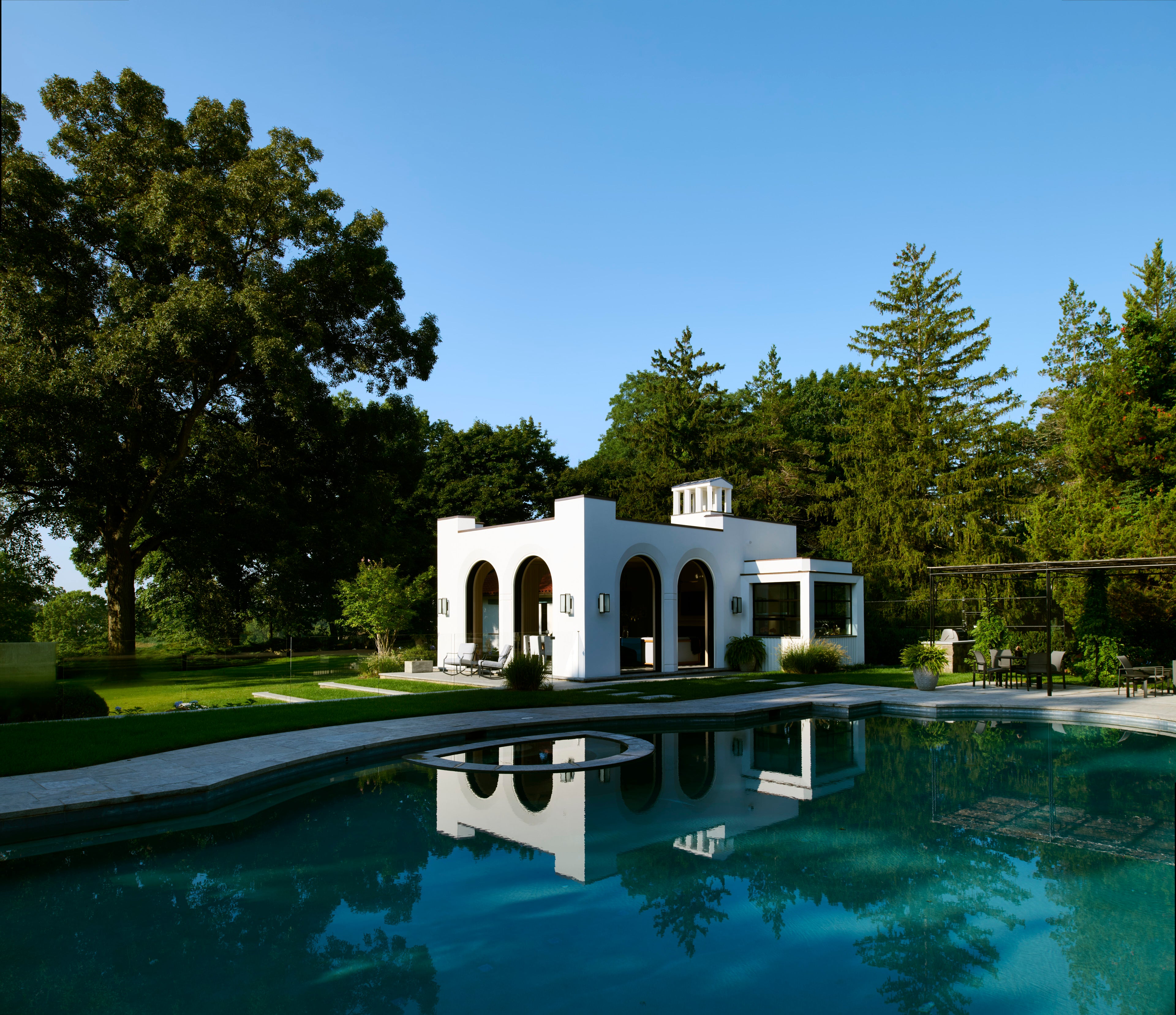 This ground up new pool house was our first project after starting LCS; conceived along with Douglas Wright Architects in a modern nod to the original architecture of the main house. The client wanted an all-weather building that could be completely opened up to house a lounge/ dining area, a small kitchen, storage & changing rooms, along with one bedroom. New pergolas were added by the pool and facing the tennis court for shady relaxation areas during playtime and downtime.