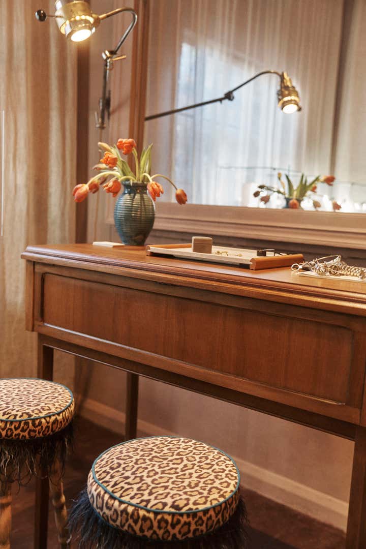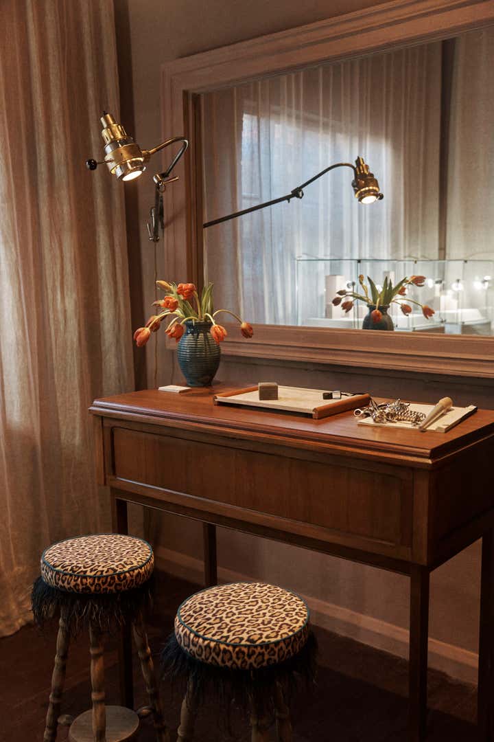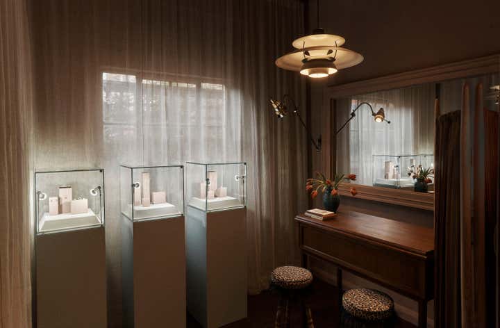 Nestled within Cockpit Studios in Bloomsbury, home to some of London’s most compelling makers, the MAYA showroom offers an intimate setting to discover the jeweler Maya Selway's poetic works. Designed and styled by the Austin and London-based studio Stelly Selway, the space reflects the jewelry’s quiet allure and refined edge. Dusted rose curtains soften the room, while custom feathered, leopard-print stools designed by co-principal Tanya Selway introduce a subtle playfulness.