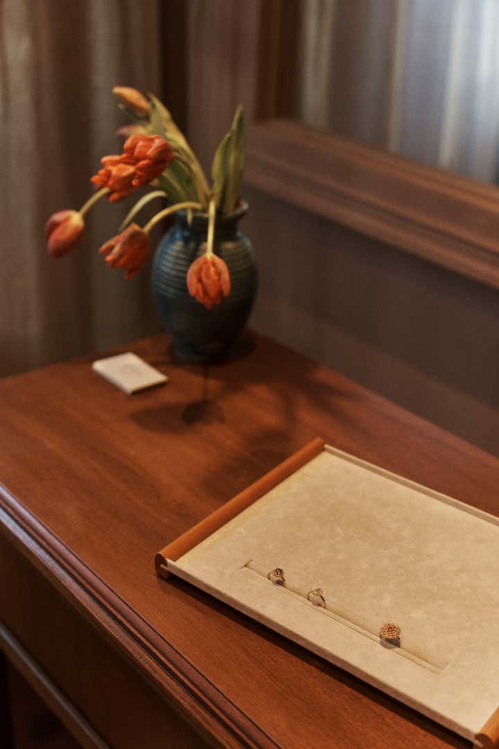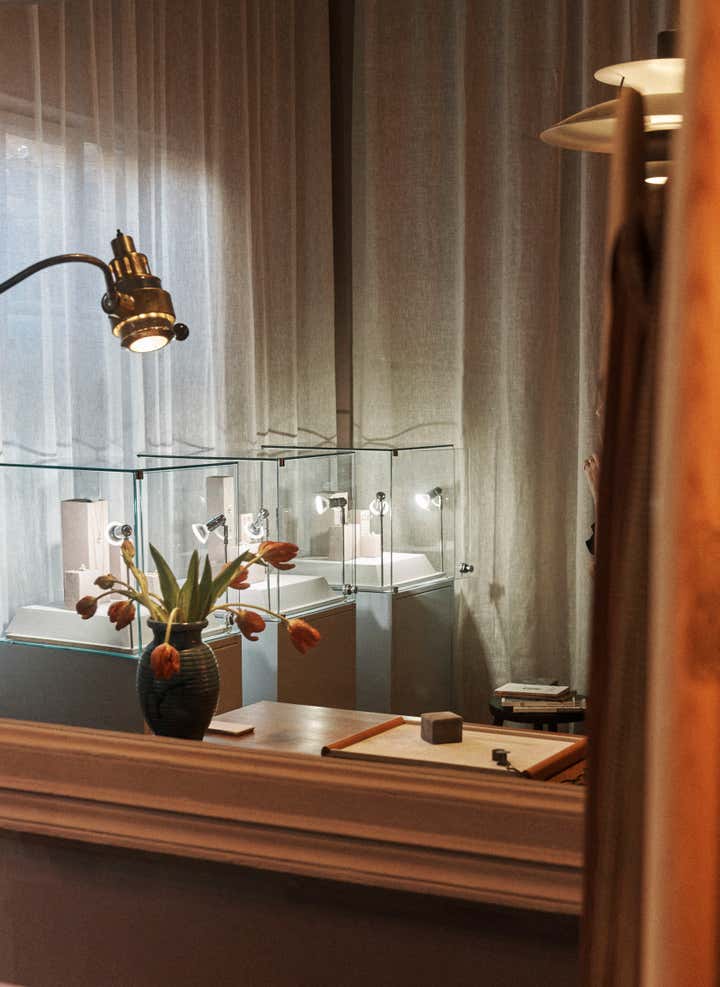 Every detail complements Maya Selway’s fine jewelry, which draws inspiration from the marks of passing time: patinated metals, scattered gems, and the beauty of imperfection. The result is a showroom that feels both timeless and tactile, a place where craftsmanship and atmosphere converge, inviting visitors to linger and explore pieces that are at once delicate and deeply personal.