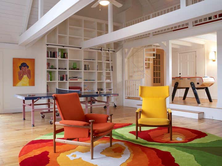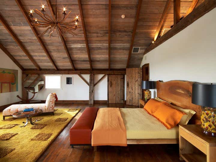 Abandoning the expected decoration of barn architecture a strategy was chosen based on contrast when it came to furnishings and art. The choice of bright yellows and oranges, large scale patterns, modern art and midcentury pieces create novel relationships with the historic elements of the property. All the windows are left bare in order to allow the light in to push back against the heavy wood structure and to allow appreciation of the views.