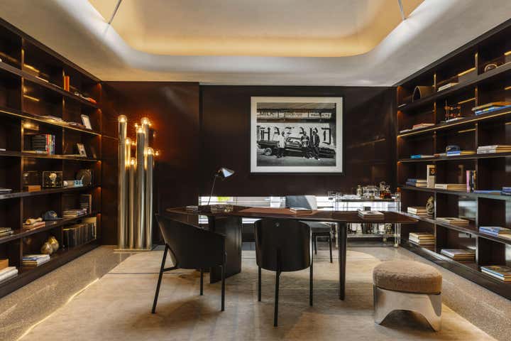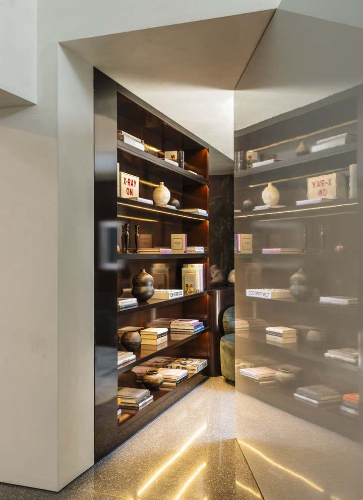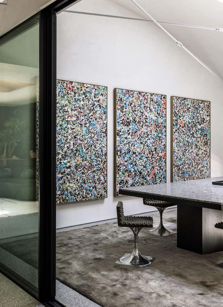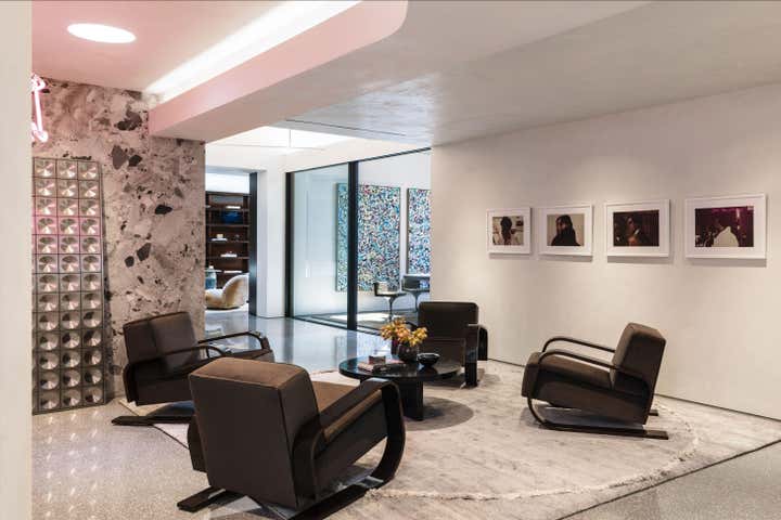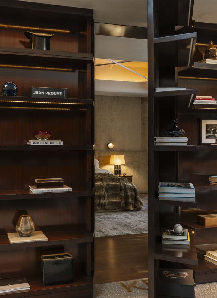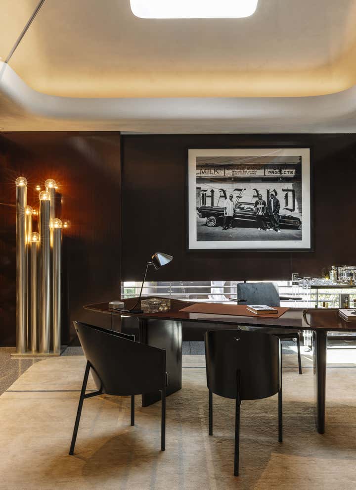 Impeccable good taste and a groovy feel meld in this vibrant office for LA real estate mogul Kurt Rappaport, above the Funke restaurant he also created and owns. Into a refurbished Art Deco office building, Clint Nicholas and architect Dan Brunn added luxe and gleaming materials – terrazzo flooring, Ceppo stone, walnut paneling, and chrome finishes – softened with shag and silk carpeting. This sets the stage for select artworks, quirky artifacts and artful retakes on classic furniture designs. A pivoting, white lacquered wall and a secret door in a dark bookcase to a sumptuously textured bedroom add to the allure that has been forged here by a client and designer who share a deep rapport.