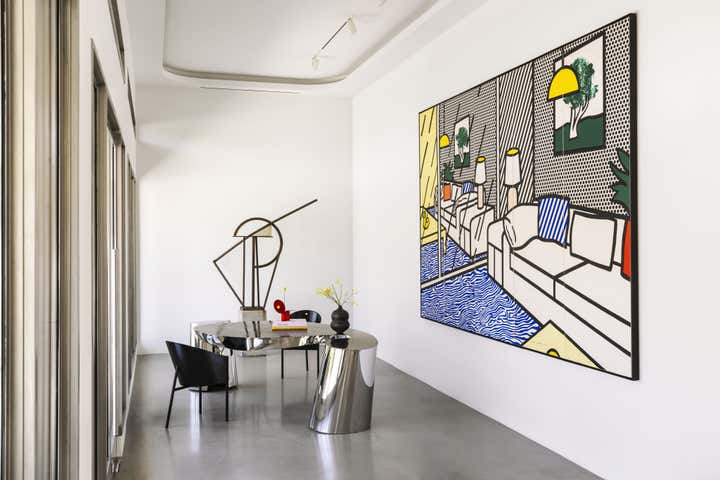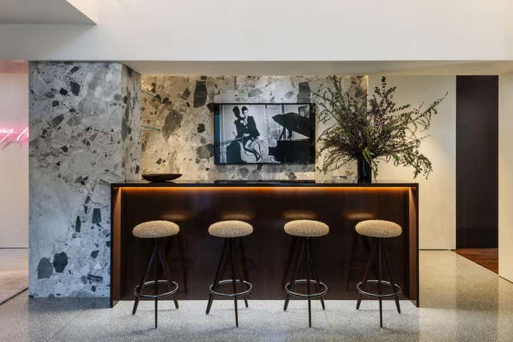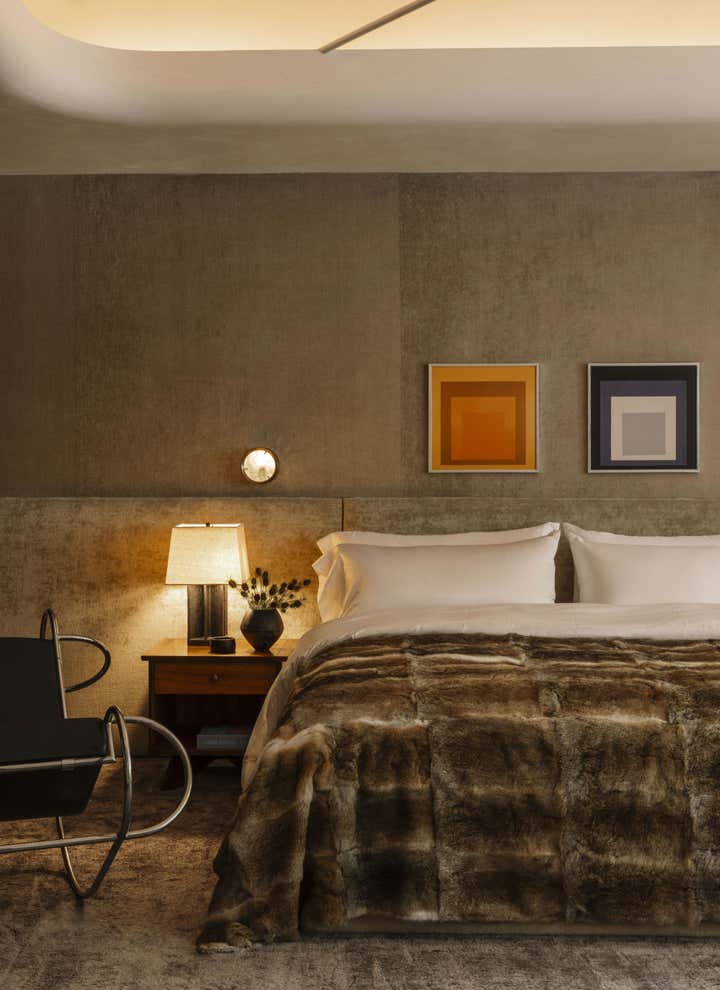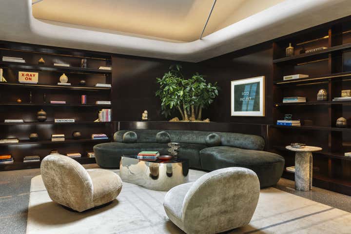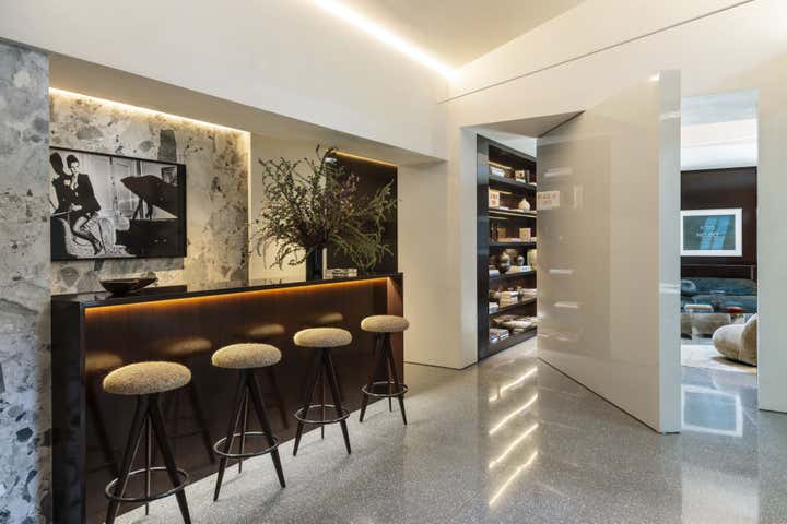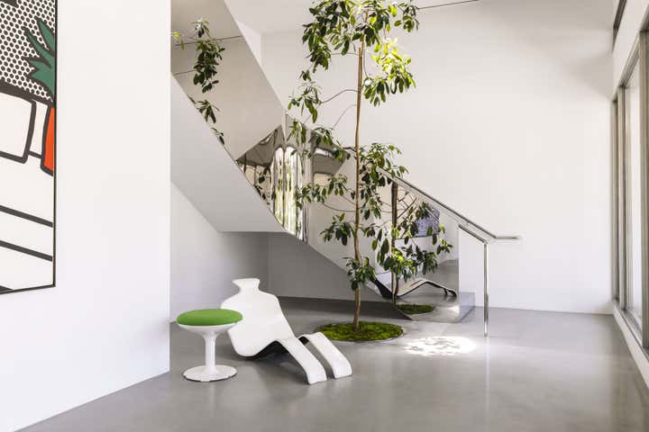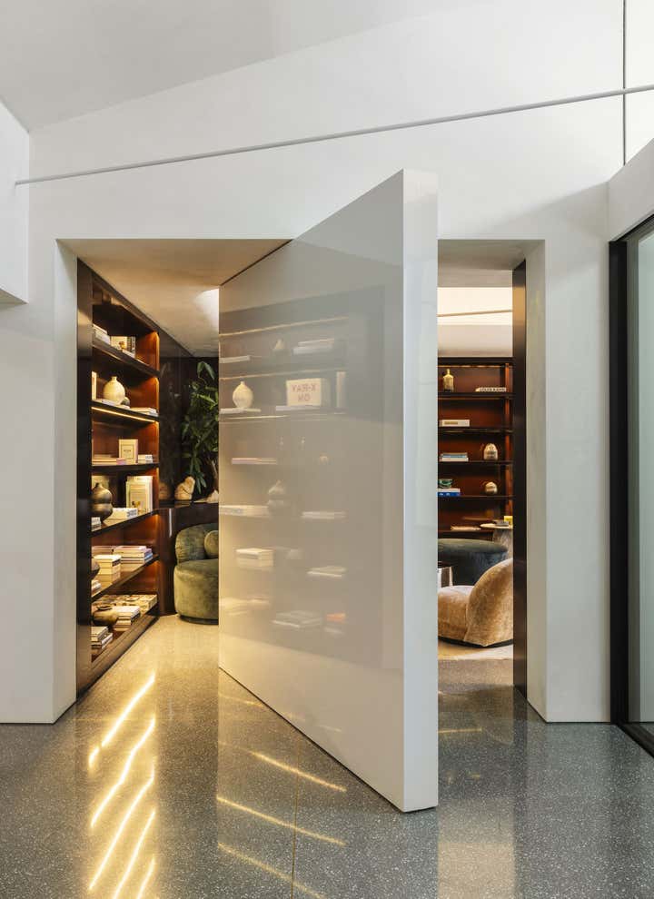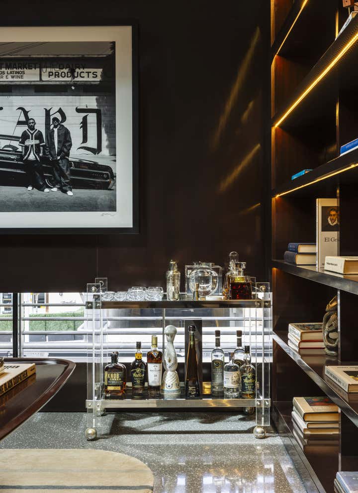 Impeccable good taste and a groovy feel meld in this vibrant office for LA real estate mogul Kurt Rappaport, above the Funke restaurant he also created and owns. Into a refurbished Art Deco office building, Clint Nicholas and architect Dan Brunn added luxe and gleaming materials – terrazzo flooring, Ceppo stone, walnut paneling, and chrome finishes – softened with shag and silk carpeting. This sets the stage for select artworks, quirky artifacts and artful retakes on classic furniture designs. A pivoting, white lacquered wall and a secret door in a dark bookcase to a sumptuously textured bedroom add to the allure that has been forged here by a client and designer who share a deep rapport.