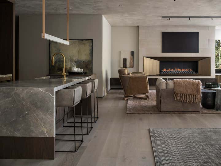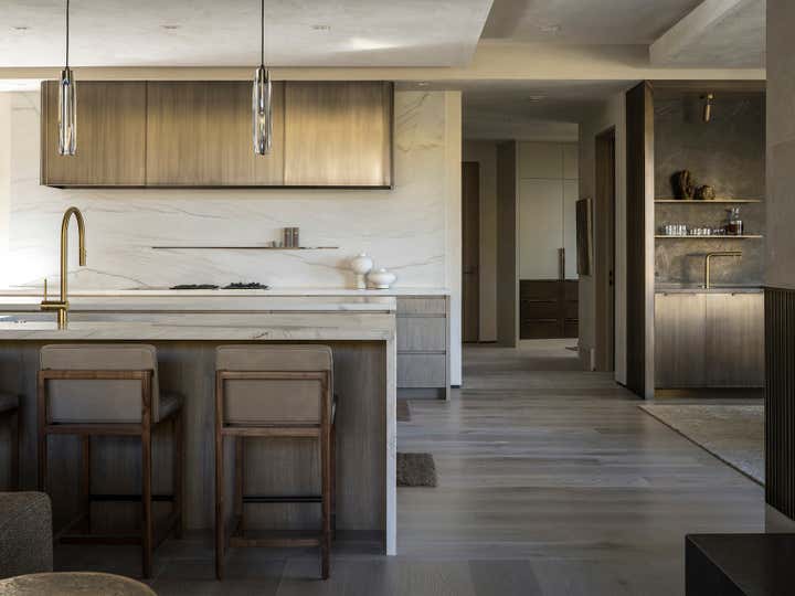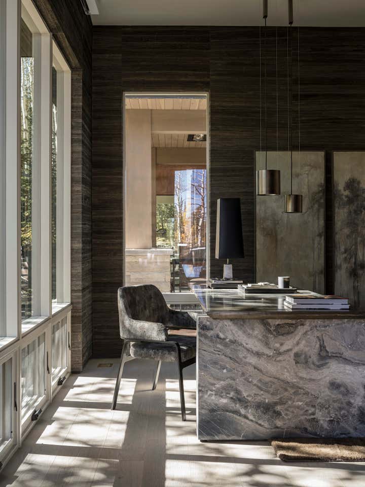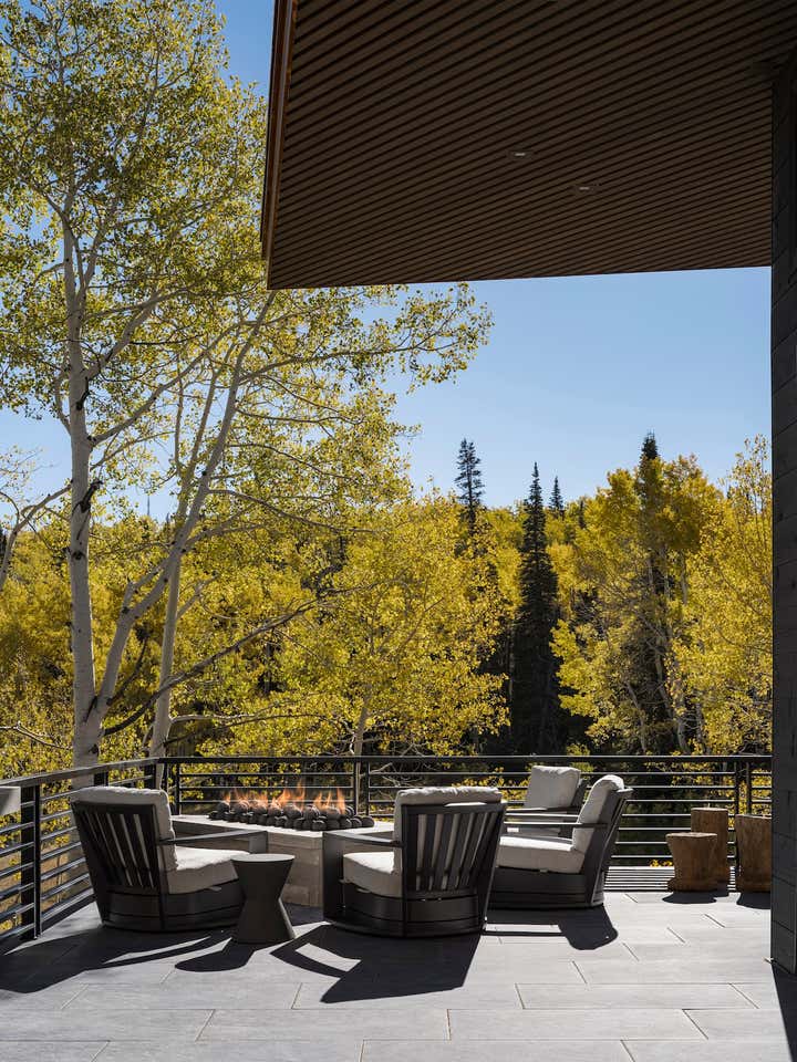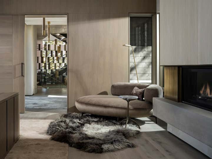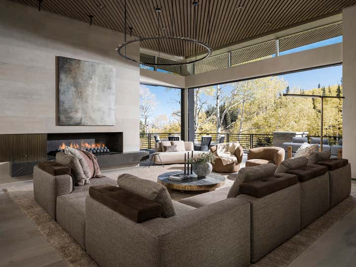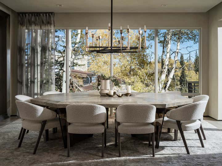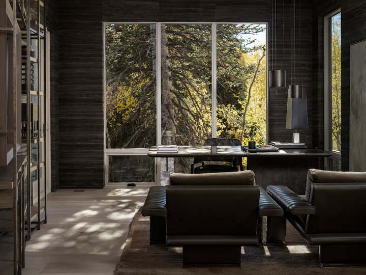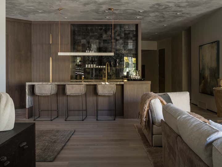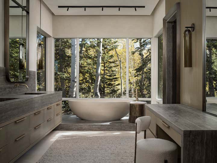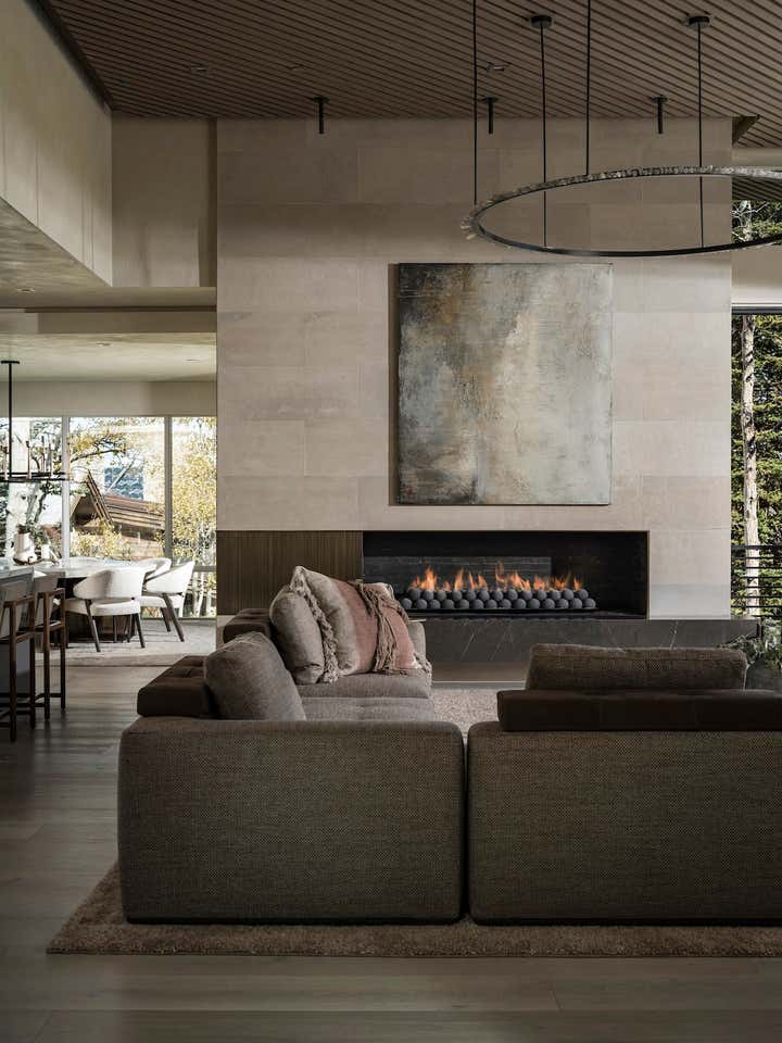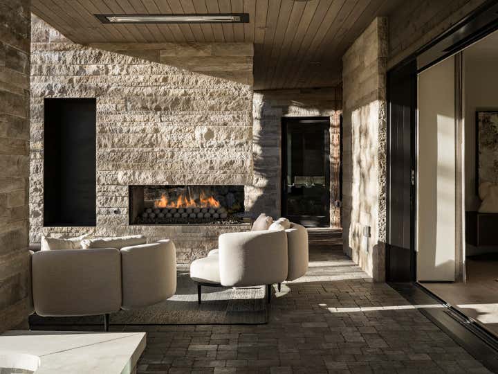 Seeking an outdoor-indoor experience with such intimate mountain views, AMB Design created refined elements of white oak merged with patina'd metals, rugged limestones, and a sense of tranquility. The furnishings, rooted in earthy naturalism, whisper informality and sanctuary.