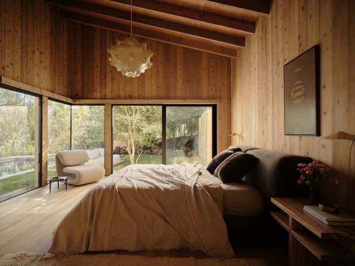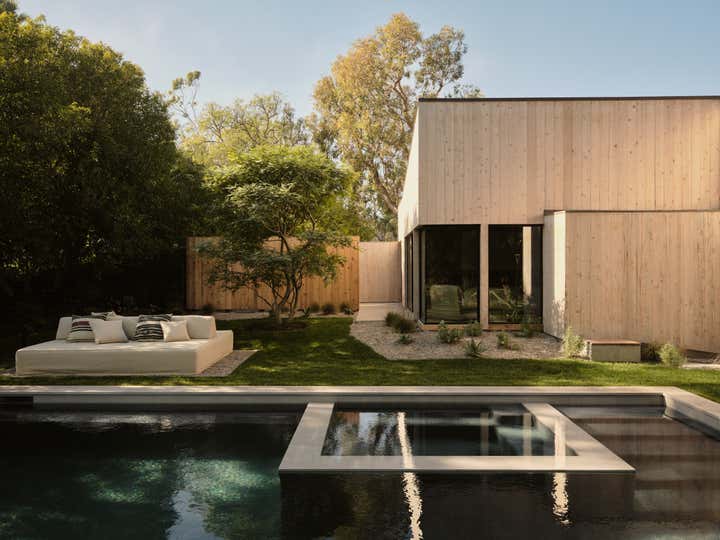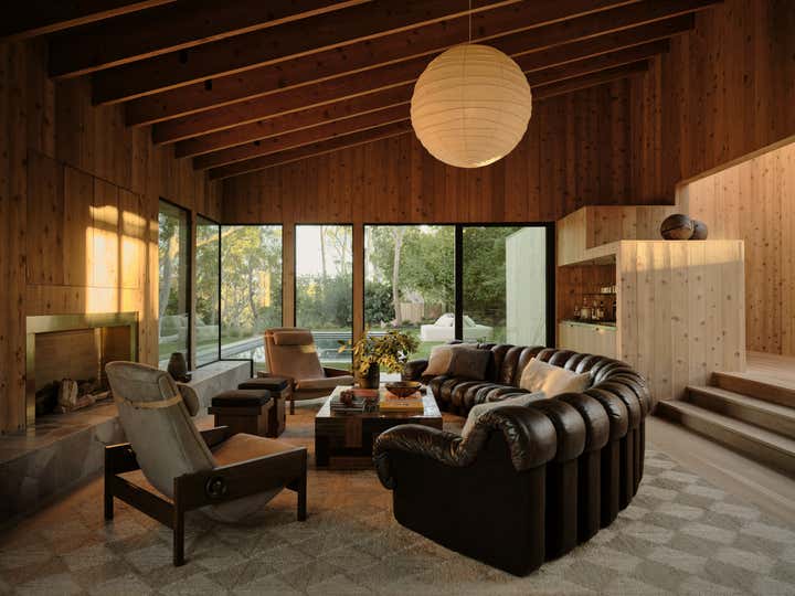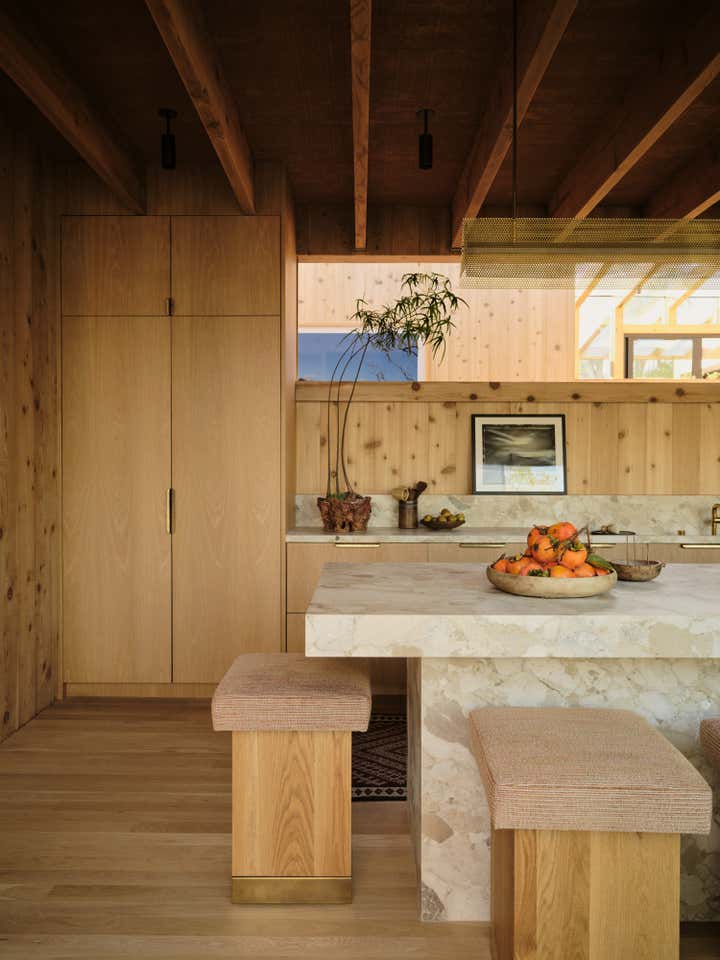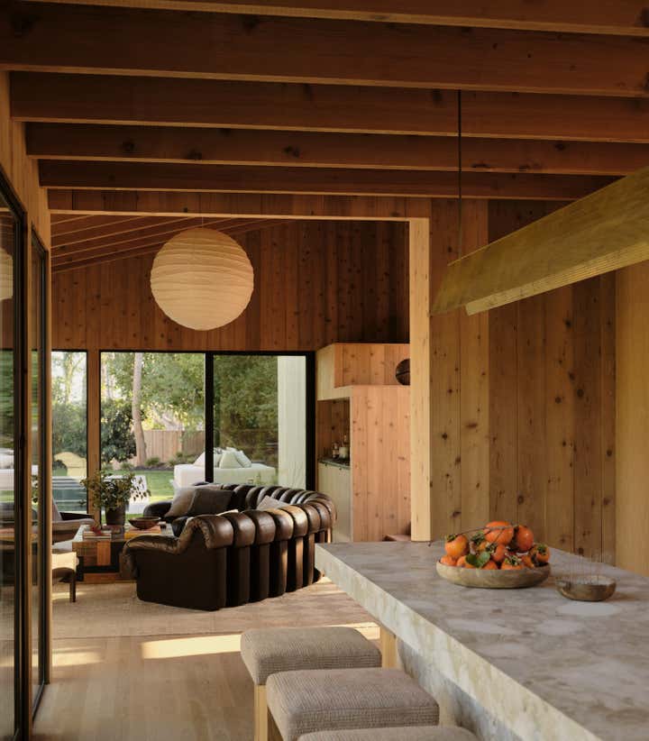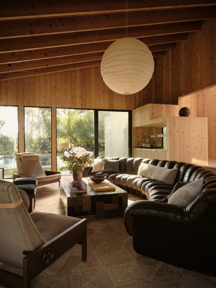 Expansive windows, skylights and passageways allow for an abundance of natural light and cross-ventilation in this sustainably minded reimagining of a post-and-beam Malibu home originally designed by architect Ronald Goldman in 1979. A collaboration between Alexander Design Build and Alexander Built Properties, the residence features custom millwork and stonework, bespoke and collectible vintage furnishings, and brass detailing for an effortlessly chic and timeless interior. A saltwater pool and drought-tolerant plantings create a tranquil outdoor oasis that seamlessly blends nature with modern luxury.
