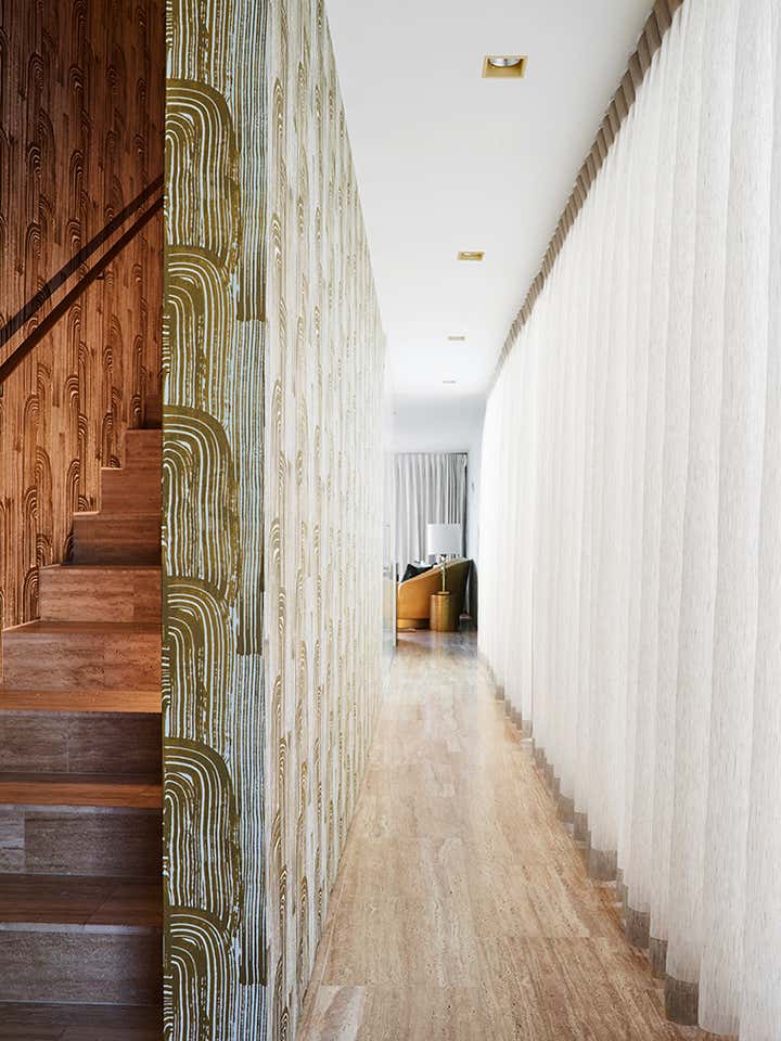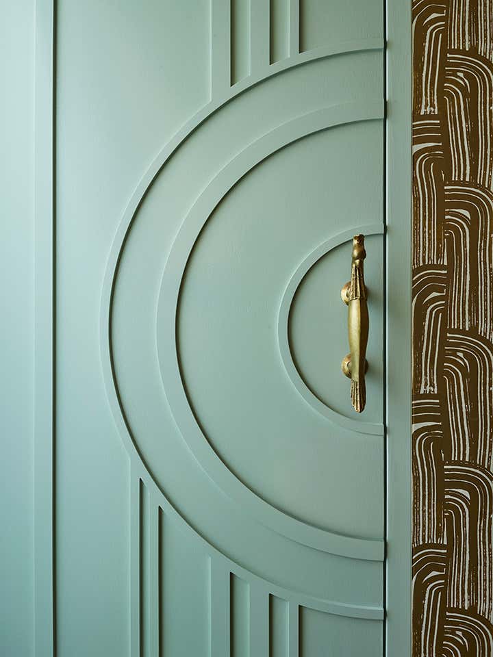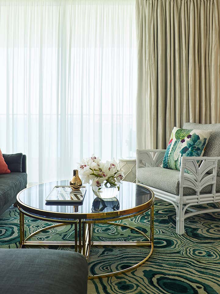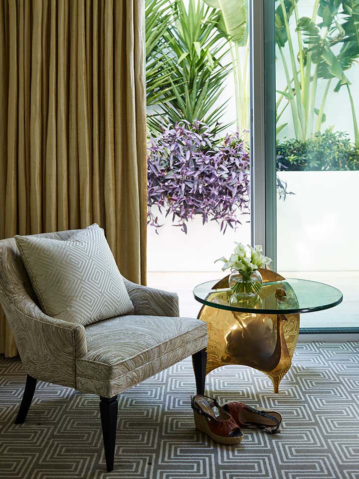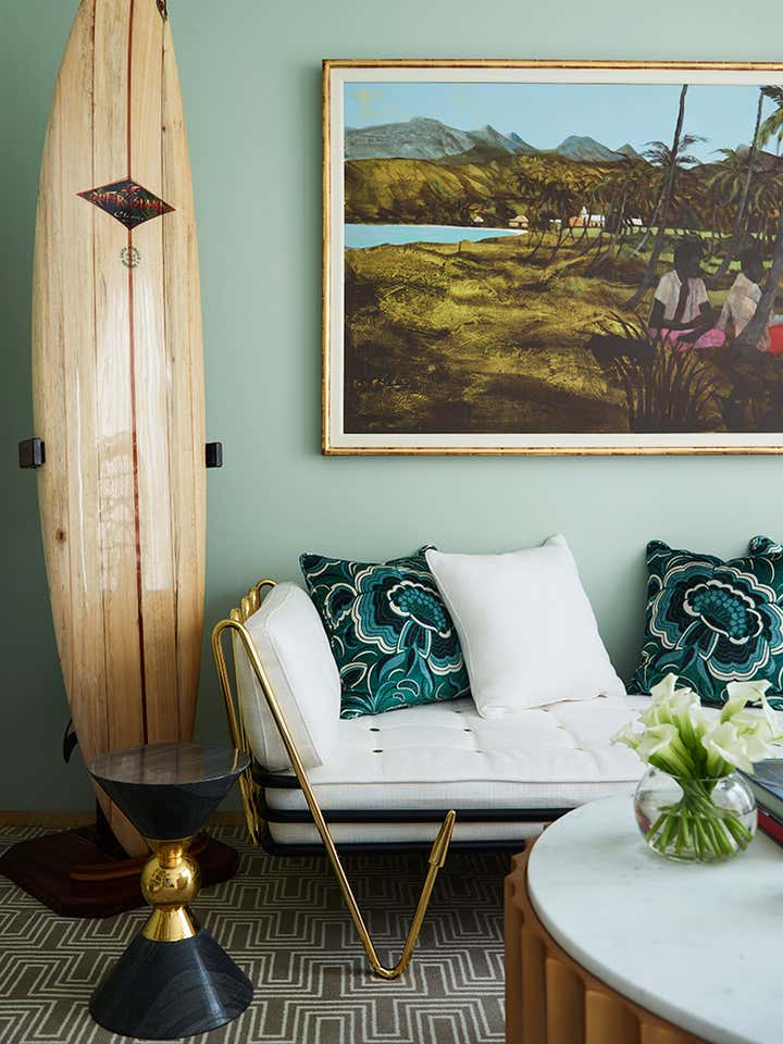 The brief for this four-bedroom beachside apartment was to create a lavish, layered interior full of colour and glamour. The client was keen to move away stylistically from the existing white minimalist interior and draw on the vivid greens she loves in an island-themed painting that now hangs in the sitting room. For Greg Natale Design, these greens – together with the warm golden tones of the travertine floors and the abundance of natural light – provided the starting point for a design that brings luxe LA style to the Sydney shores. The apartment walls are painted a pale seafoam green throughout, interspersed with variations and concentrations of the hue in the artworks, a green-tiled splashback in the kitchen, and stunning hand-painted de Gournay wallpaper in the living room. Here, velvet-upholstered armchairs pick up the soft green tones, while a Dorothy Draper sofa offers contrast in warm camel-hued leather.