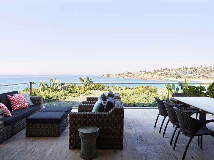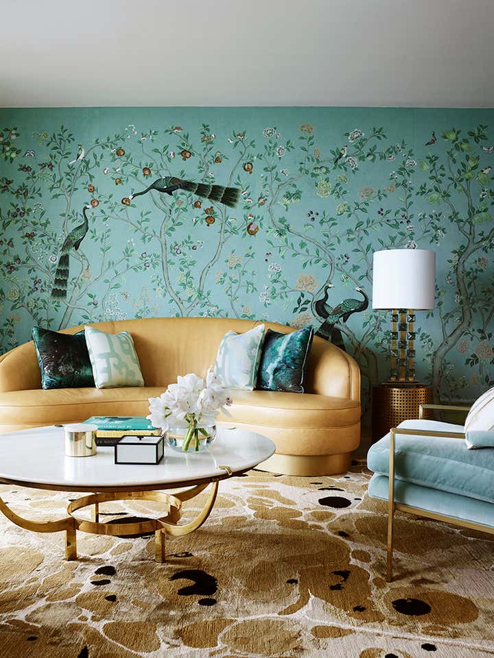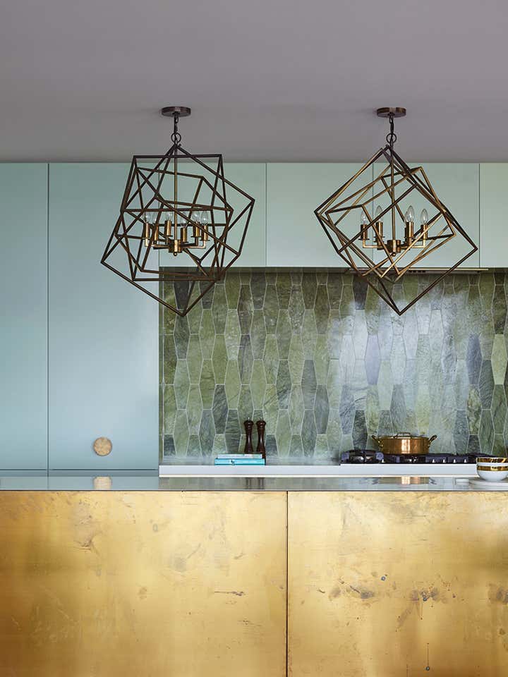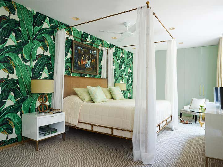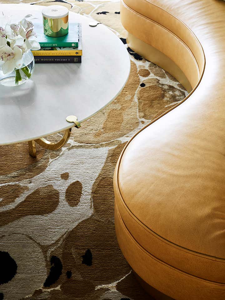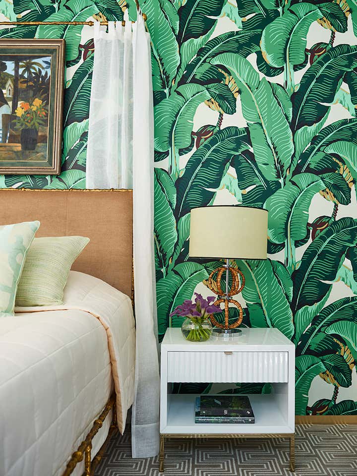 The brief for this four-bedroom beachside apartment was to create a lavish, layered interior full of colour and glamour. The client was keen to move away stylistically from the existing white minimalist interior and draw on the vivid greens she loves in an island-themed painting that now hangs in the sitting room. For Greg Natale Design, these greens – together with the warm golden tones of the travertine floors and the abundance of natural light – provided the starting point for a design that brings luxe LA style to the Sydney shores. The apartment walls are painted a pale seafoam green throughout, interspersed with variations and concentrations of the hue in the artworks, a green-tiled splashback in the kitchen, and stunning hand-painted de Gournay wallpaper in the living room. Here, velvet-upholstered armchairs pick up the soft green tones, while a Dorothy Draper sofa offers contrast in warm camel-hued leather.