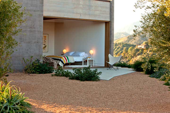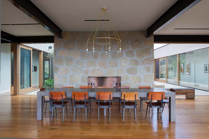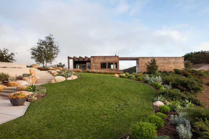 The owners wanted to build a getaway house outside of Los Angeles where they could find a balance between the modern design they desired and a more direct relationship to nature. After a two year search in the Southern California region they discovered pristine acreage near Montecito at the top of a mountain and adjacent to park land. The site strategy is one of slow revelation and discovery of the house and- ultimately- the view. The road, which had to be built for access, brings the visitor to a point below the house- where a formal stair leads up to the entry sequence. The front door frames and reveals views of the Santa Barbara coastline through the courtyard. A 40’ wide horizontal ‘panavison’-esque opening gives the house a pavilion-like atmosphere. The dwelling is organized around three courtyards; the primary one at the heart of the house also serves as the front entrance and outdoor living room.