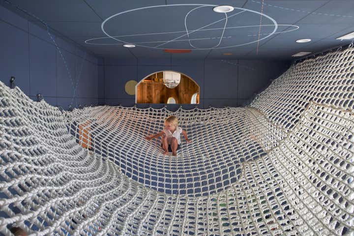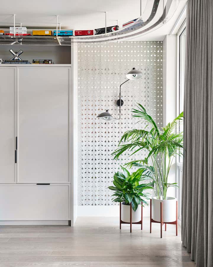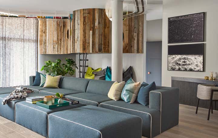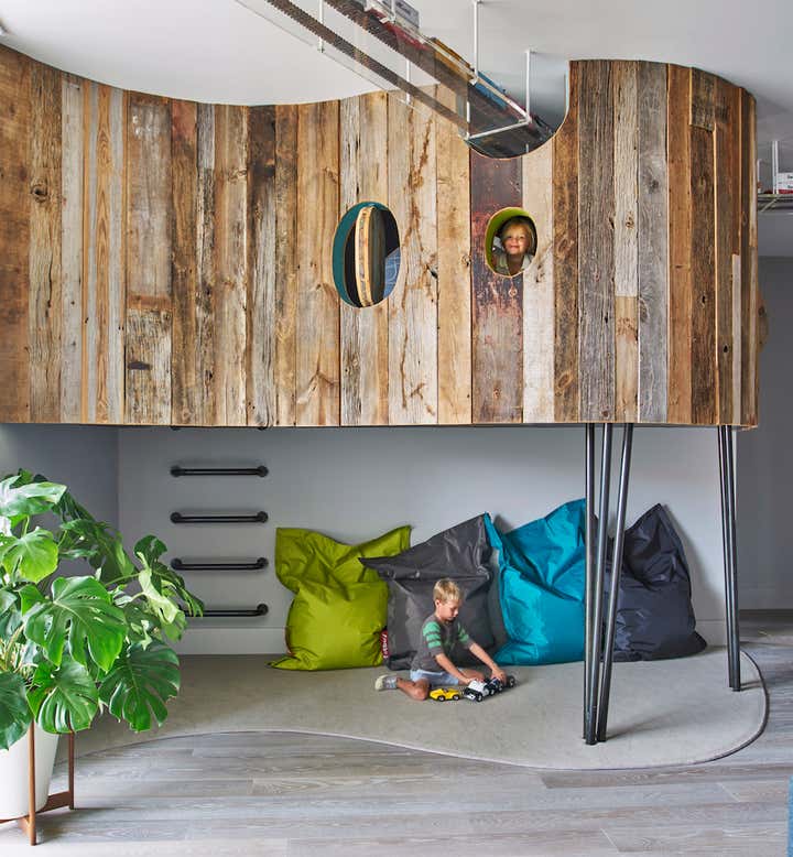 An enthusiastic uncle fond of hosting large family parties sought to build a bachelor pad fit for kids to play in Chicago’s Wicker Park neighborhood. Formerly two units, this reimagined triplex was equipped with a custom treehouse clad in reclaimed cedar while an electric train was installed to navigate the ceiling perimeter. Chic but durable textiles were chosen for the furnishings, ensuring functional but sophisticated spaces for adults and children alike.