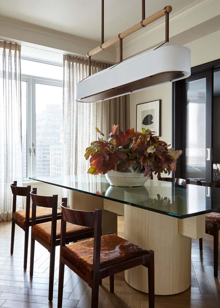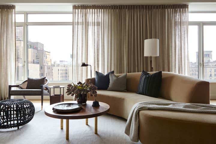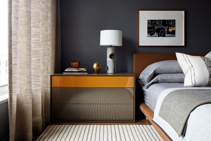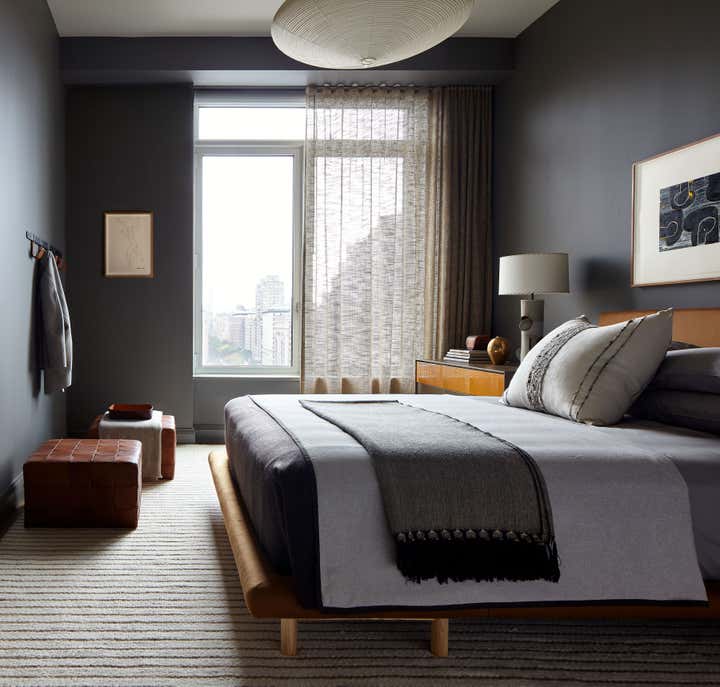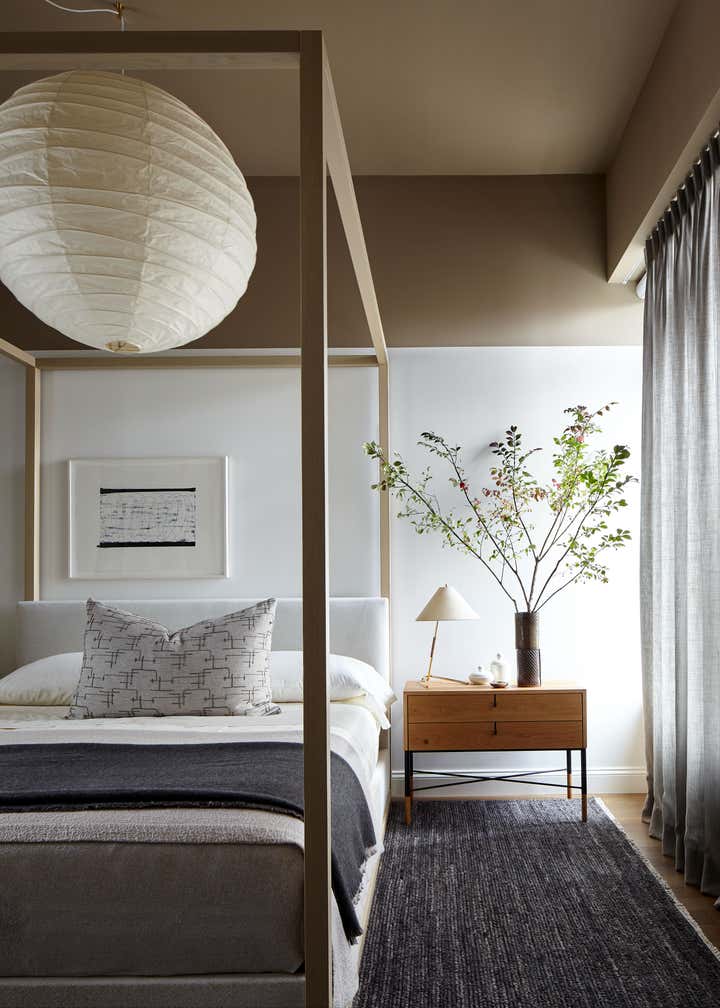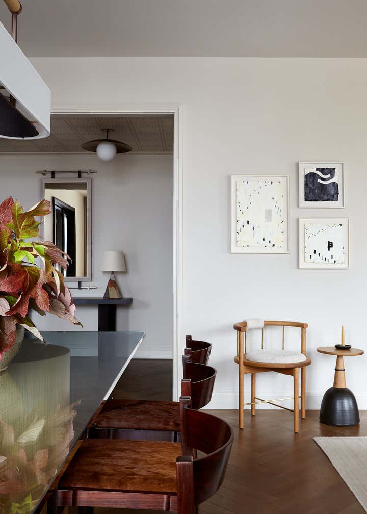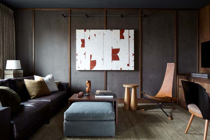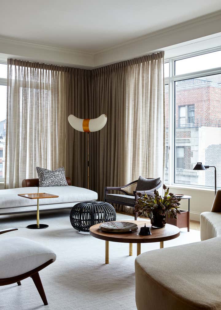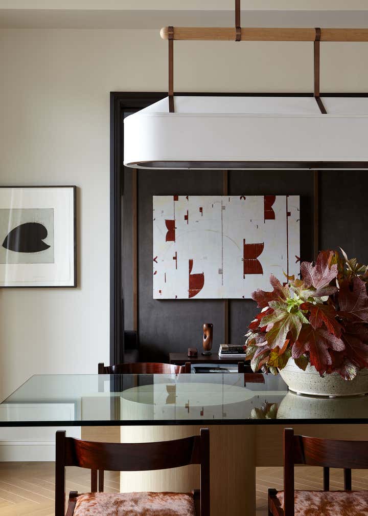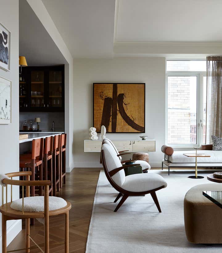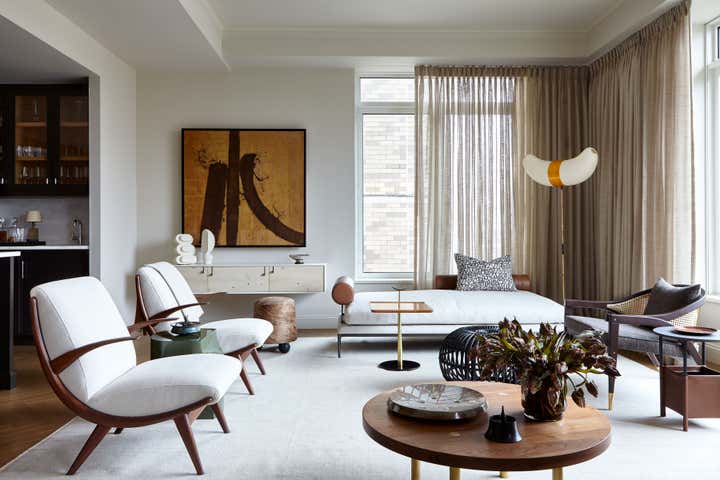 Through a considered mixture of American mid-century furniture, chosen for its human proportions, and a strict, graphic color palette of neutrals and rust, a casual yet elegant home was created, one well suited to entertaining.