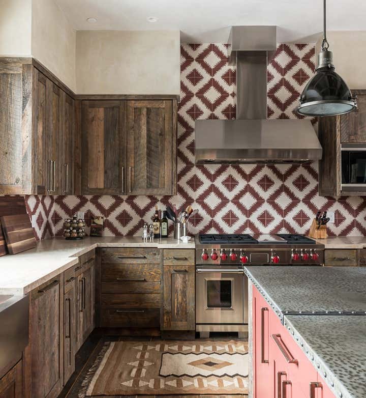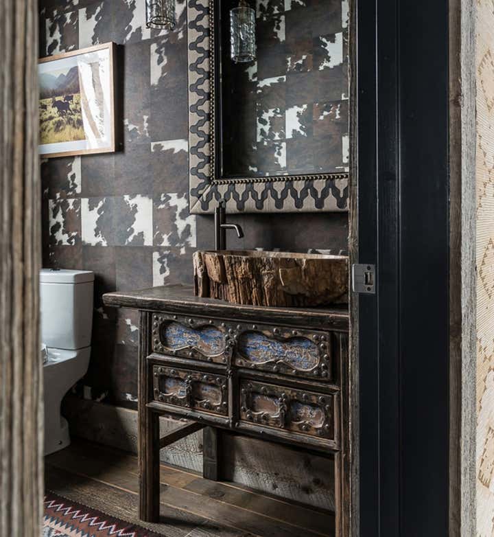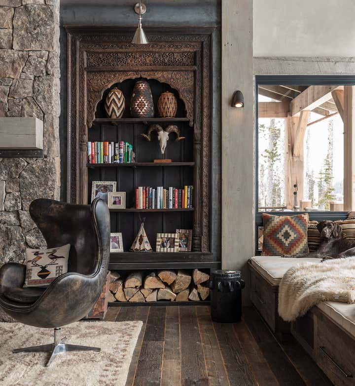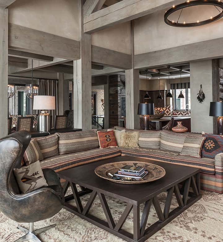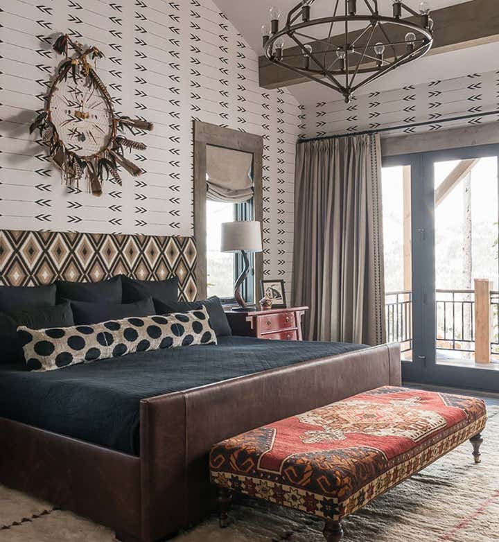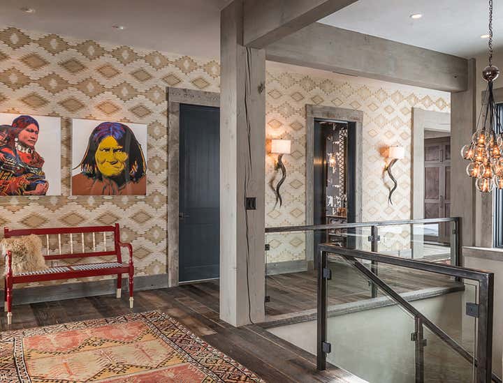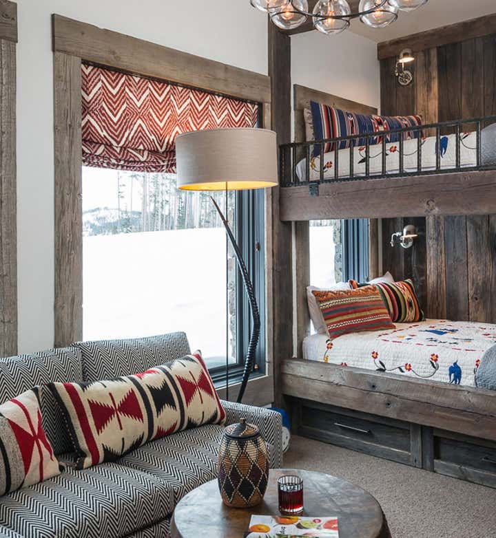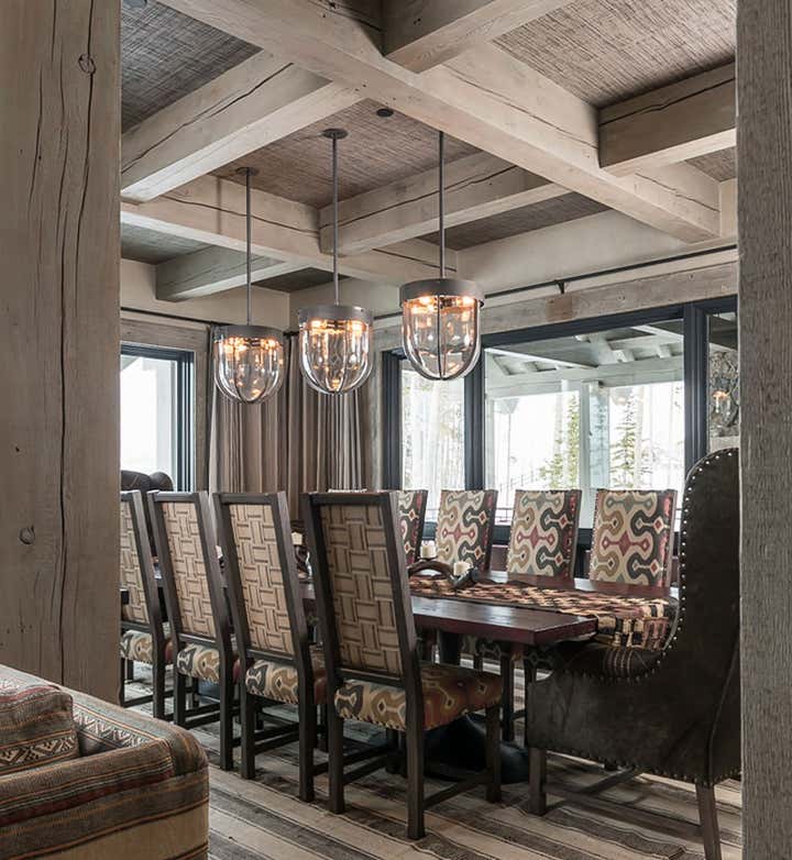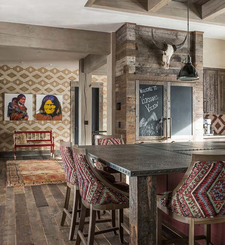 Juxtaposition exudes: modern lighting against raw timbers, modern style upholstery with Native American Textiles. The design marries an American lumberjack with an ornamented worldly princess – and they really like each other!
