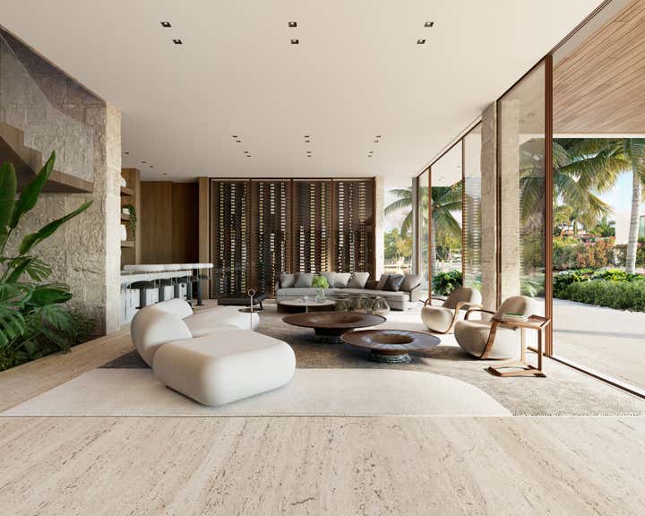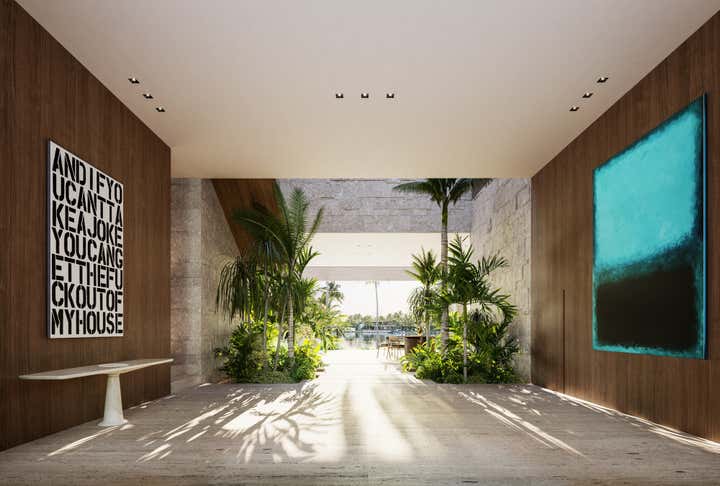 The wood-clad foyer features artwork by Christopher Wool and Mark Rothko, framed by textured stone walls that extend throughout the home. Palm trees line the hallway to the grand room, enhancing the connection to nature. Hidden doors and powder rooms maintain an uninterrupted flow.