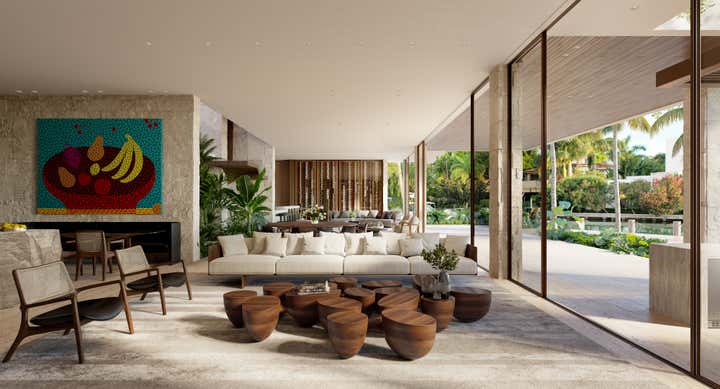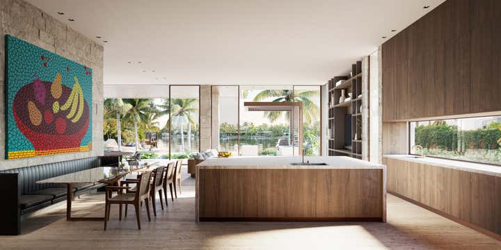The dining area sits between the living and family rooms. A wooden table is paired with curated dining chairs, while the family room—defined by stone columns—features cane-back armchairs, a drum-style wood coffee table, and a stone-metal shelving unit. A vibrant Yayoi Kusama painting adds tropical flair near the kitchen, where wood-wrapped islands and custom stone slabs elevate the design. A breakfast nook includes a leather banquette and glass table.