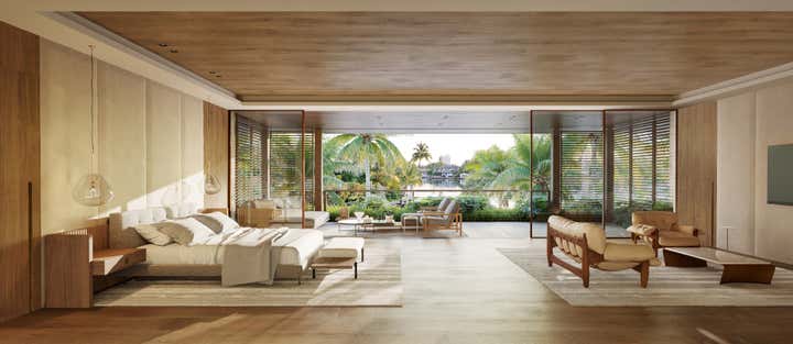 The expansive primary suite spans the home's width. Wide wood planks on floor and ceiling, a Minotti bed framed by suede panels, and airy glass pendants create a serene retreat. A cozy lounge area with Sergio Rodrigues seating adds intimacy. The spa-like bathroom features silver and black travertine, a floating glass shower, and a sculptural tub.