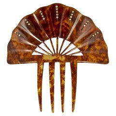 Ornate Victorian Gold Filled and Faux Pearl Comb from the late 19th Century. Large scale set with glass pearls and gilt swag chains hinged on a blond tortoiseshell comb. 1880's Franc...