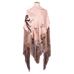 A marvel to behold. This original 1930's cerulean blue silk chiffon shawl, with a pattern of blooming florals in shades of, tan, brown, green and dark green, is a rare piece to behol...