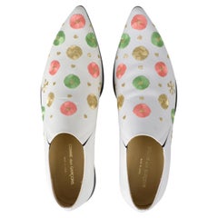 These vintage Giuseppe Zanotti Couture mules, crafted in Italy in the 1990s, combine artisanal detail with timeless wearability. The uppers feature hand-stitched floral needlepoint embroidery in bold, romantic colors set against a dark ground, offering both charm and sophistication. The classic pointed toe silhouette and kitten heel elevate the look while ensuring comfort and versatility. Ways to Wear: • Dress them up: Pair with a silk slip dress, tailored trousers, or an evening skirt for a refined, romantic look. The floral embroidery makes them perfect for garden parties, weddings, or evening cocktails. • Dress them down: Style with denim, linen trousers, or a crisp white blouse for an effortlessly chic daytime outfit. The needlepoint detail adds a unique vintage touch even to casual looks. • Comfort & versatility: The modest 2.5 inch kitten heel gives just the right amount of lift without sacrificing comfort, making these a sensible yet stylish choice for long wear. The slip-on mule design allows easy transitions from day to night. Craftsmanship Details: • Designer: Giuseppe Zanotti Couture (Vicini) • Era: 1990s • Style: Needlepoint floral mule with pointed toe • Heel Height: Approx. 2.5 in / 6.3 cm • Insole: Metallic plum leather with Giuseppe Zanotti Couture imprint • Sole: Leather, stamped Vicini – Made in Italy – Vero Cuoio • Size: 8.5 AA (narrow fit) • Country of Origin: Italy A rare collectible for vintage shoe enthusiasts, these mules offer the perfect balance of artistry, wearability, and Italian luxury. Giuseppe Zanotti vintage...
