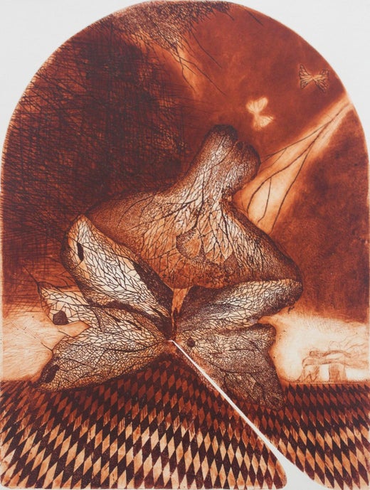 Irena SnarskaLa tragédie du papillon - XXe siècle, gravure à l'eau-forte abstraite, monochrome1990