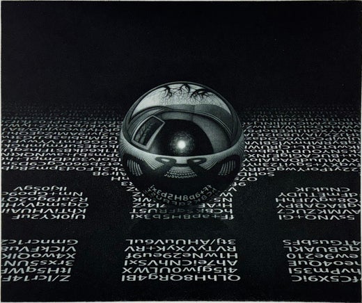 Les illusions et les reflets des gravures de Sietins font souvent penser à M.C. Escher à l'esprit, mais ses gravures ont une sensation distinctive qui leur est propre. Les chiffres se reflètent dans la boule, ainsi que l'image surréaliste d'une fenêtre s'ouvrant sur un arbre et une scène extérieure. Tirage signé et numéroté de l'édition de 35 exemplaires.