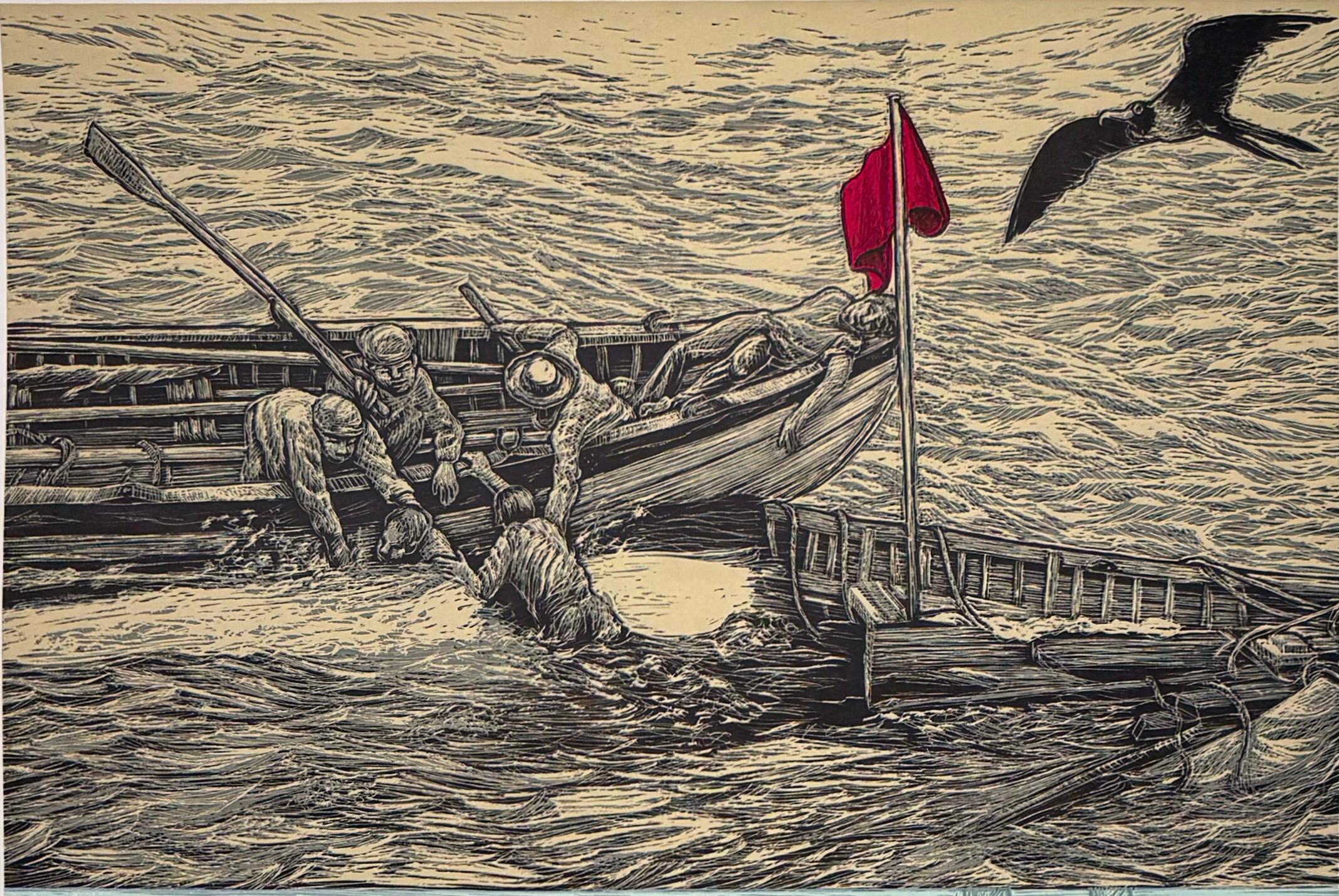 Une épreuve du cycle de Jos Sances concernant Moby Dick. Un immense cachalot dérive sous la surface, marqué par les harpons, tandis qu'au-dessus flotte un survivant solitaire sur un ...