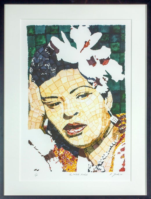 Belle impression giclée en édition limitée sur papier d'art d'un portrait à l'aquarelle de Billie Holiday par l'artiste afro-américain Richard Yarde. Numéroté à la main 11/300, titré "The White Orchid" et signé à la main par R. Yarde '04. Encadré sous verre dans un cadre en bois noir. Taille de l'image : 29 x 18 pouces.