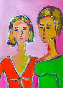 Cette peinture fait partie de la série Modern Muses, où des figures contemporaines habitent des moments calmes de réflexion et d'interaction subtile. Deux personnages sans visage son...