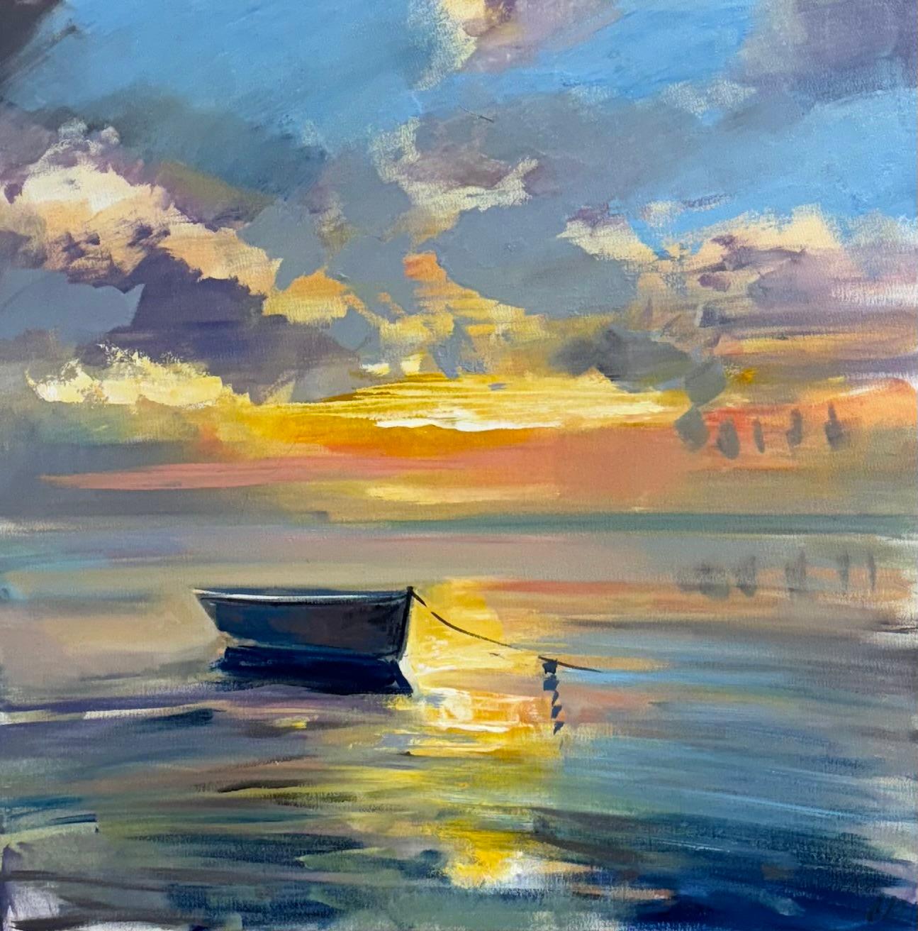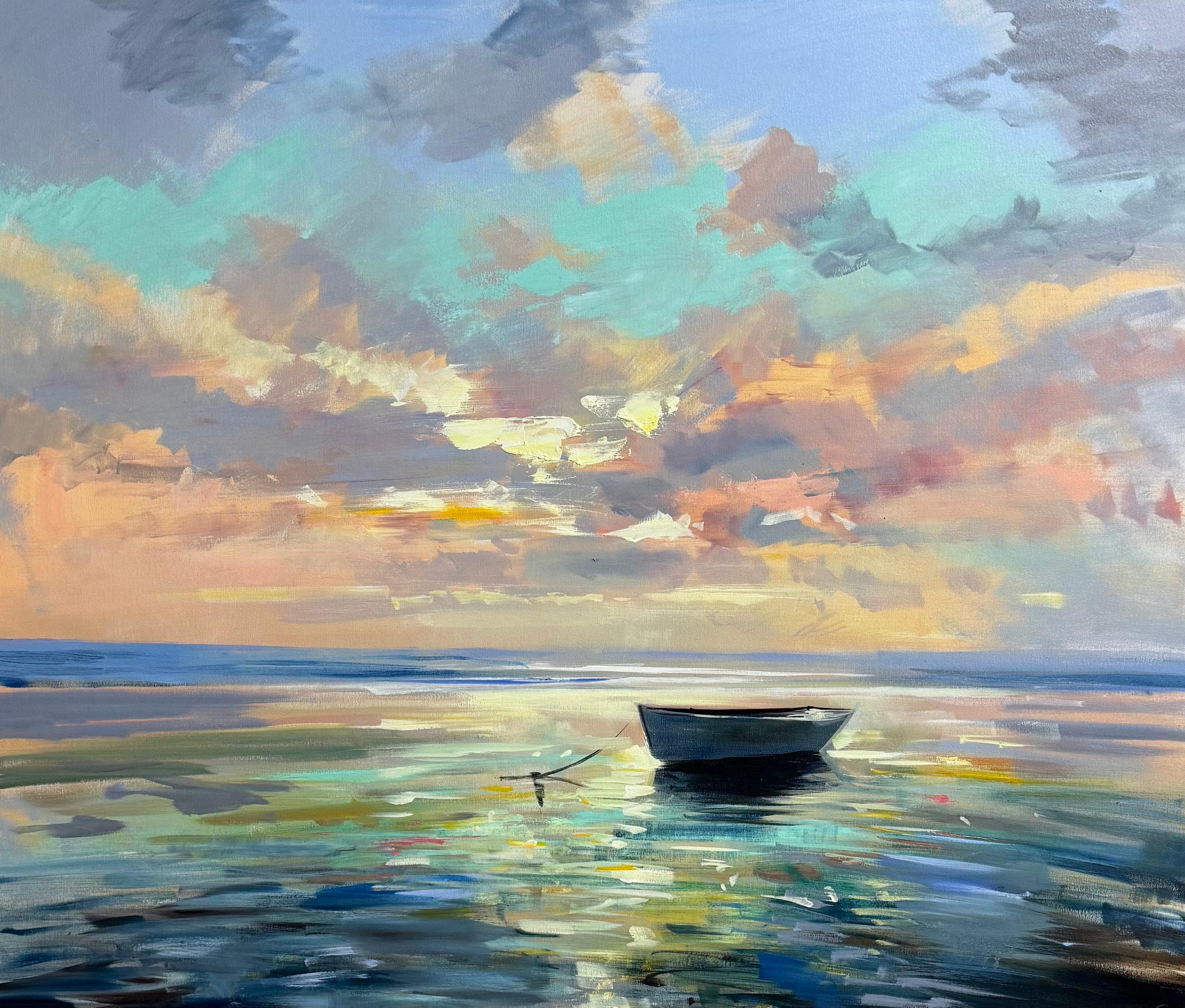 Un moment de silence entre le jour et la nuit. La mer est encore froide et sombre, mais les premiers rayons du soleil apparaissent déjà sur l'eau, signe de commencement, de mouvement...