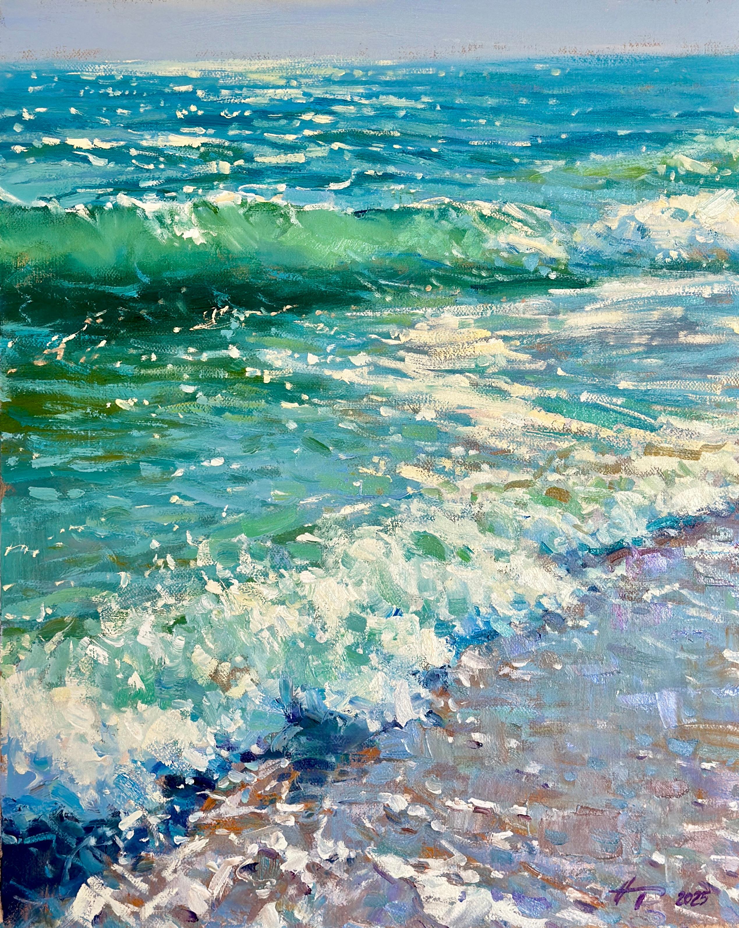 "Eternal Pulse" - Peinture à l'huile d'une vague de l'océan dans la palette raffinée de Vert Bosphore