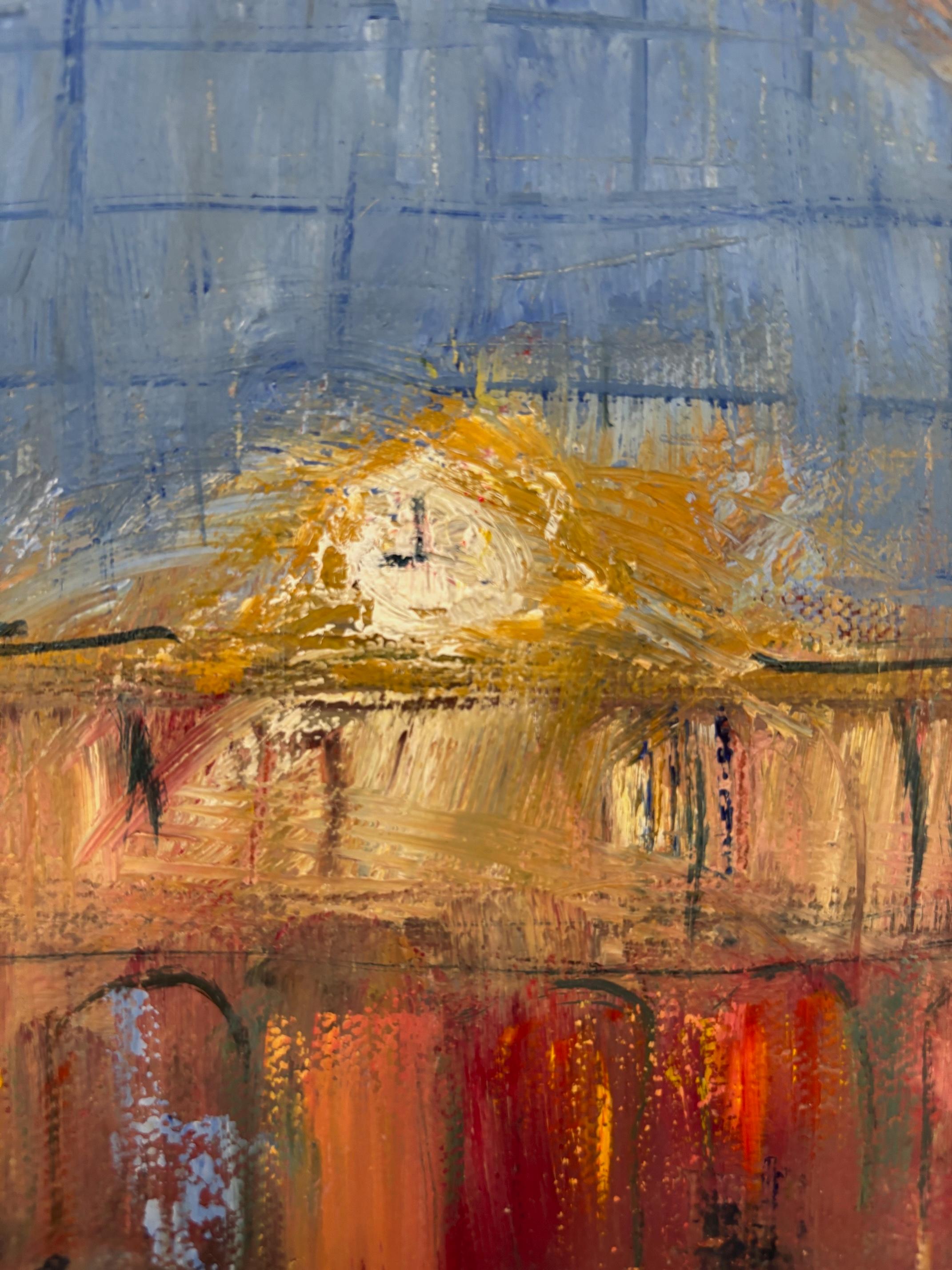"City of Gold", contemporain, paysage, pourpres, bleus, rouges, peinture à l'huile.