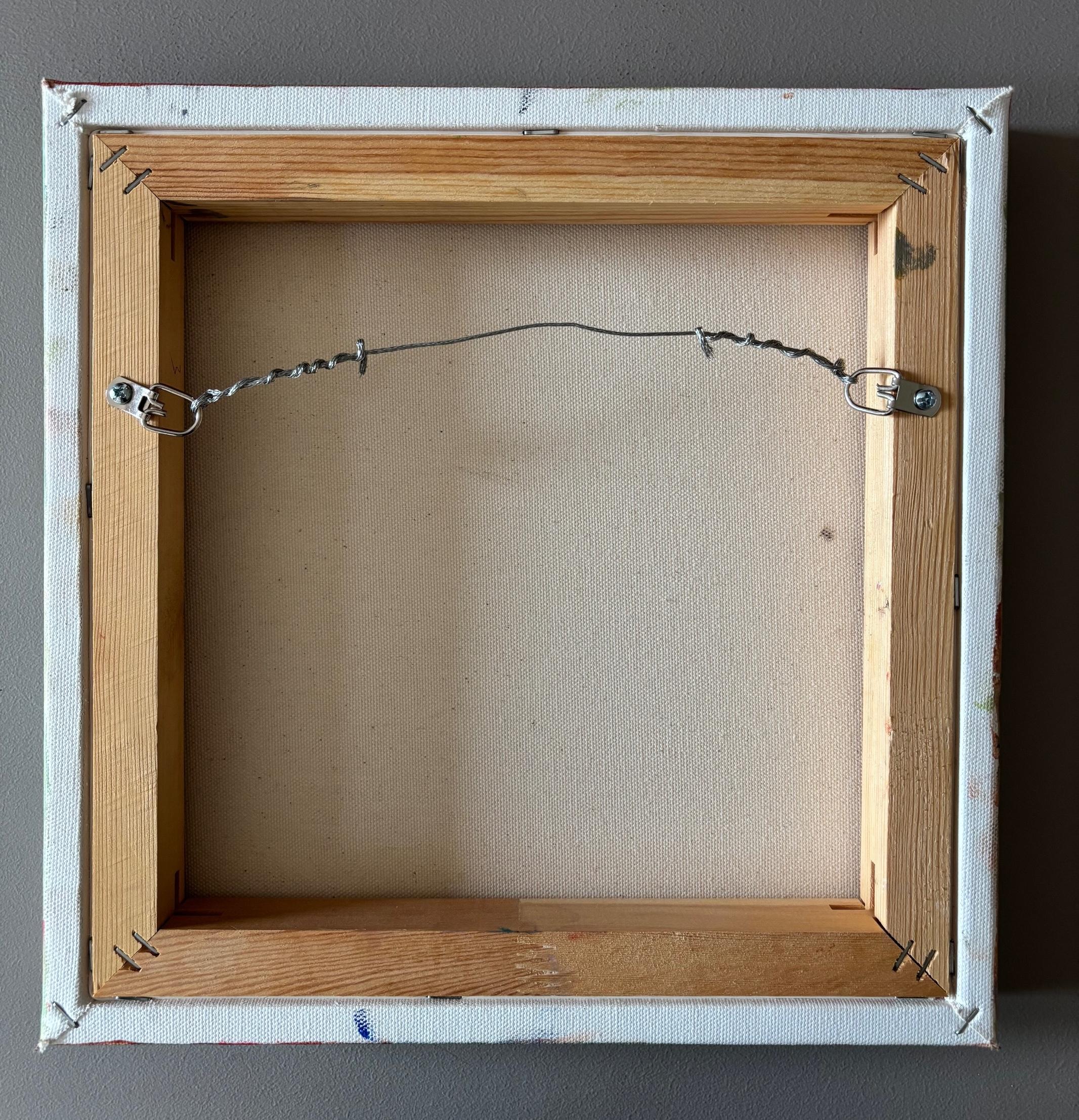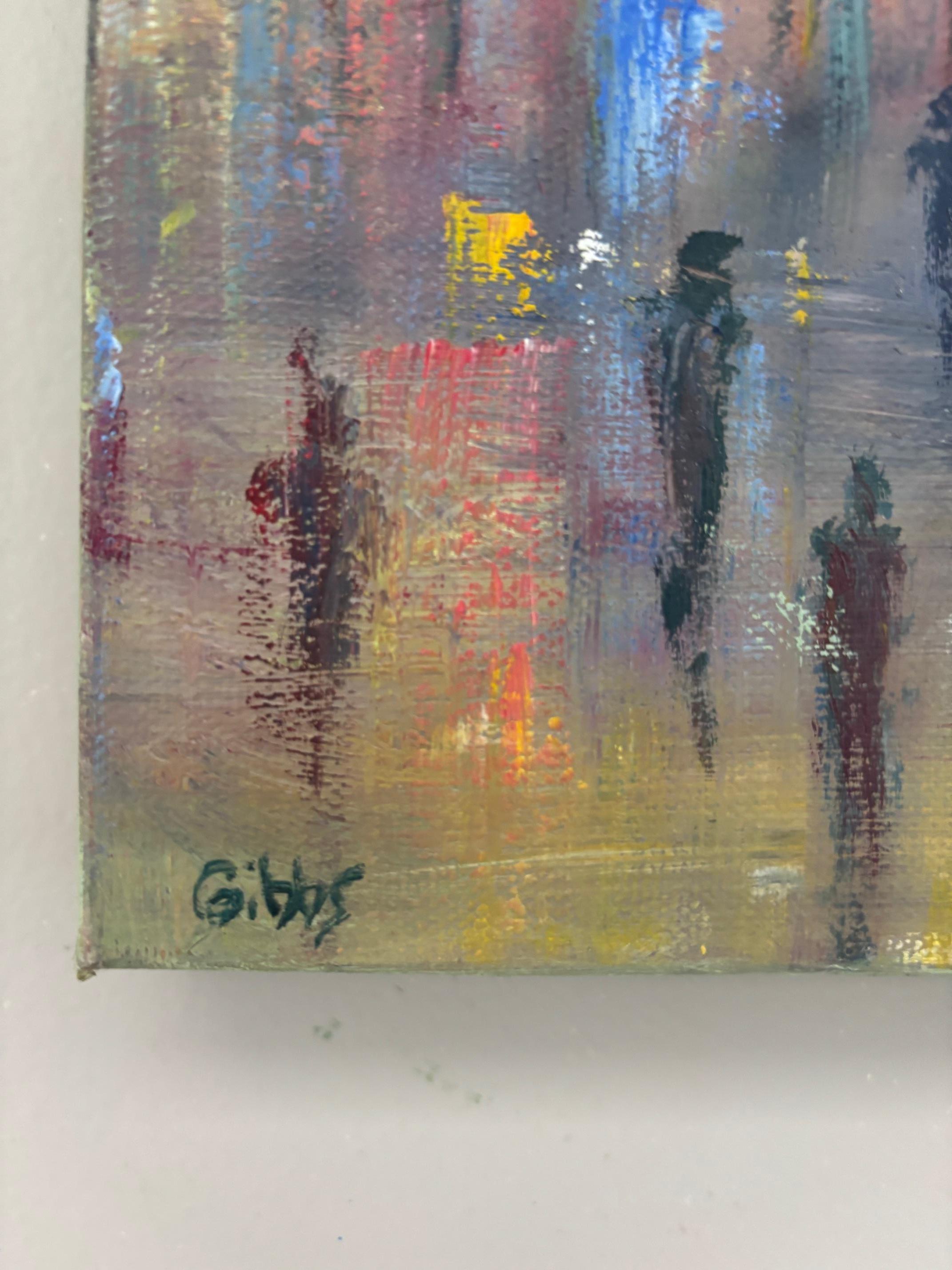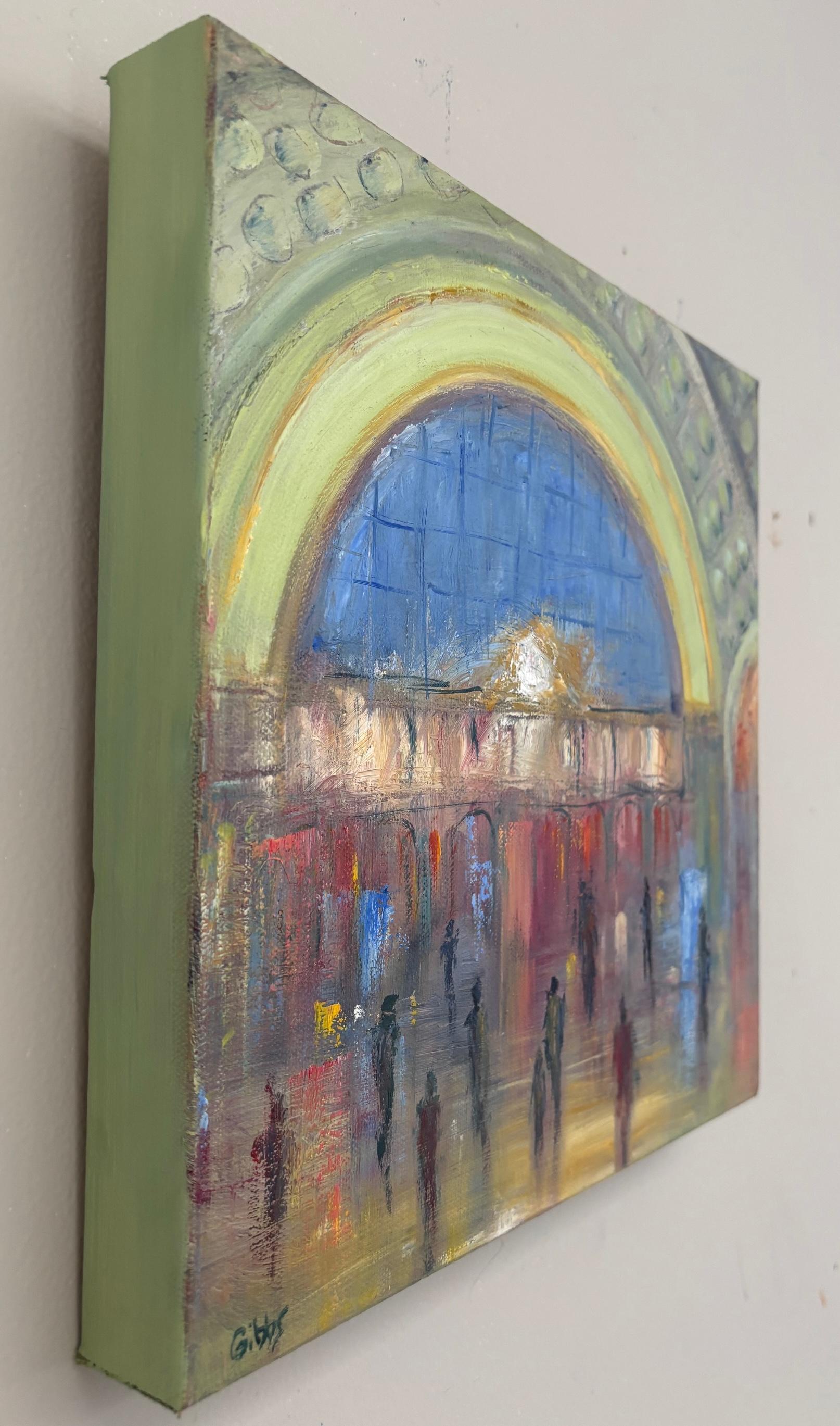 "Union Station Rush" de Catherine Picard-Gibbs est une peinture à l'huile de 12 x 12 x 1,5 pouces sur toile de style galerie, créée dans une palette de bleu et de vert avec des touches vibrantes de rouge et d'orange. La pièce illustre l'effervescence de la gare Union de Washington, C.I.D., à l'heure de pointe, pleine de mouvement et d'énergie. Les côtés sont peints en vert pour compléter la composition, et le tableau est livré câblé et prêt à être accroché.