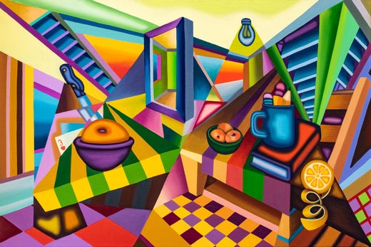 SYNTAX RUMBLE - Peinture à l'huile cubiste jaune et verte de Nebula, illustration surréaliste