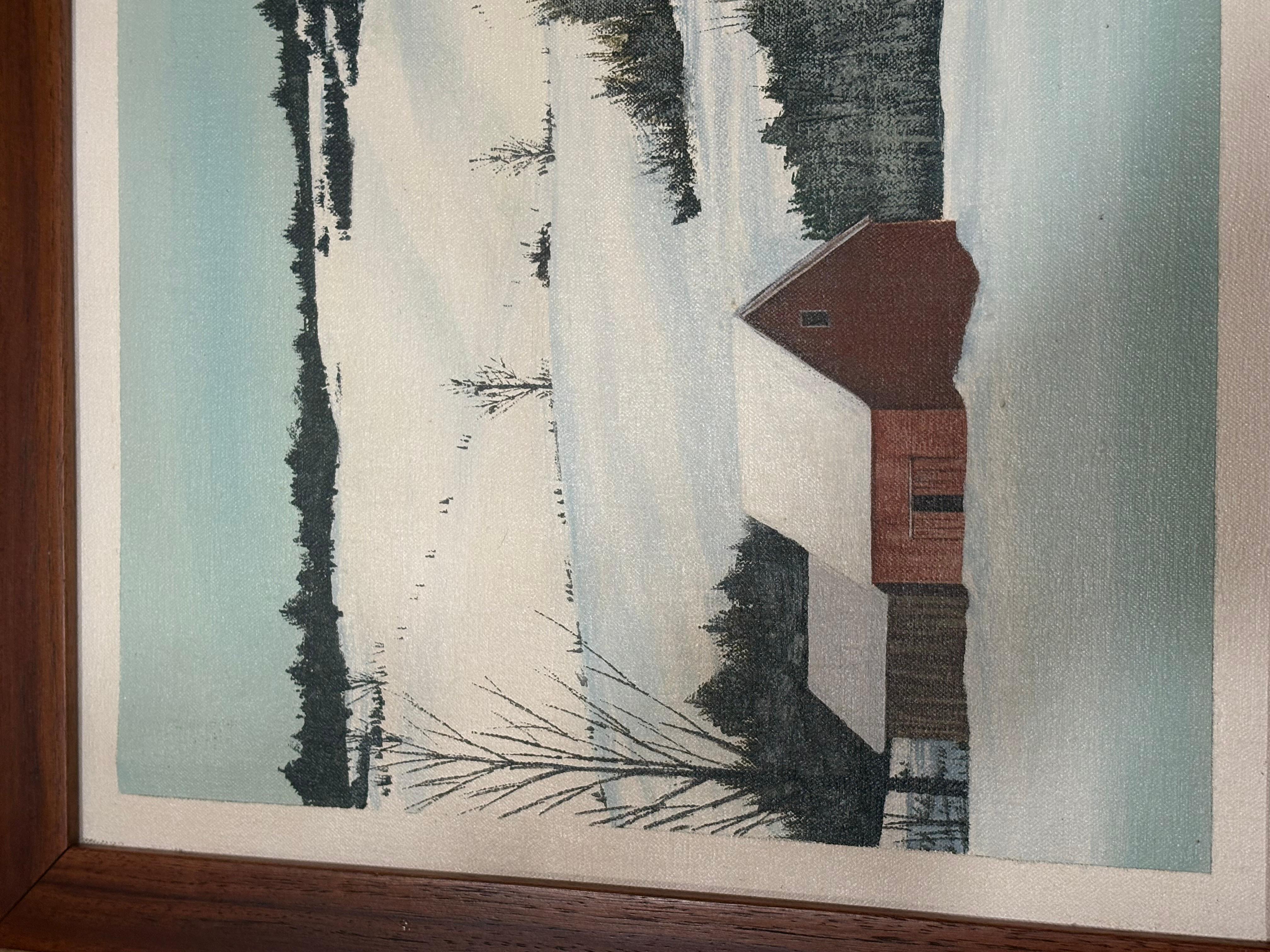 Peinture à l'huile américaine moderne des années 1940 représentant un paysage rural en hiver. Cette œuvre est présentée dans un cadre rustique en bois de grange, probablement d'origine.