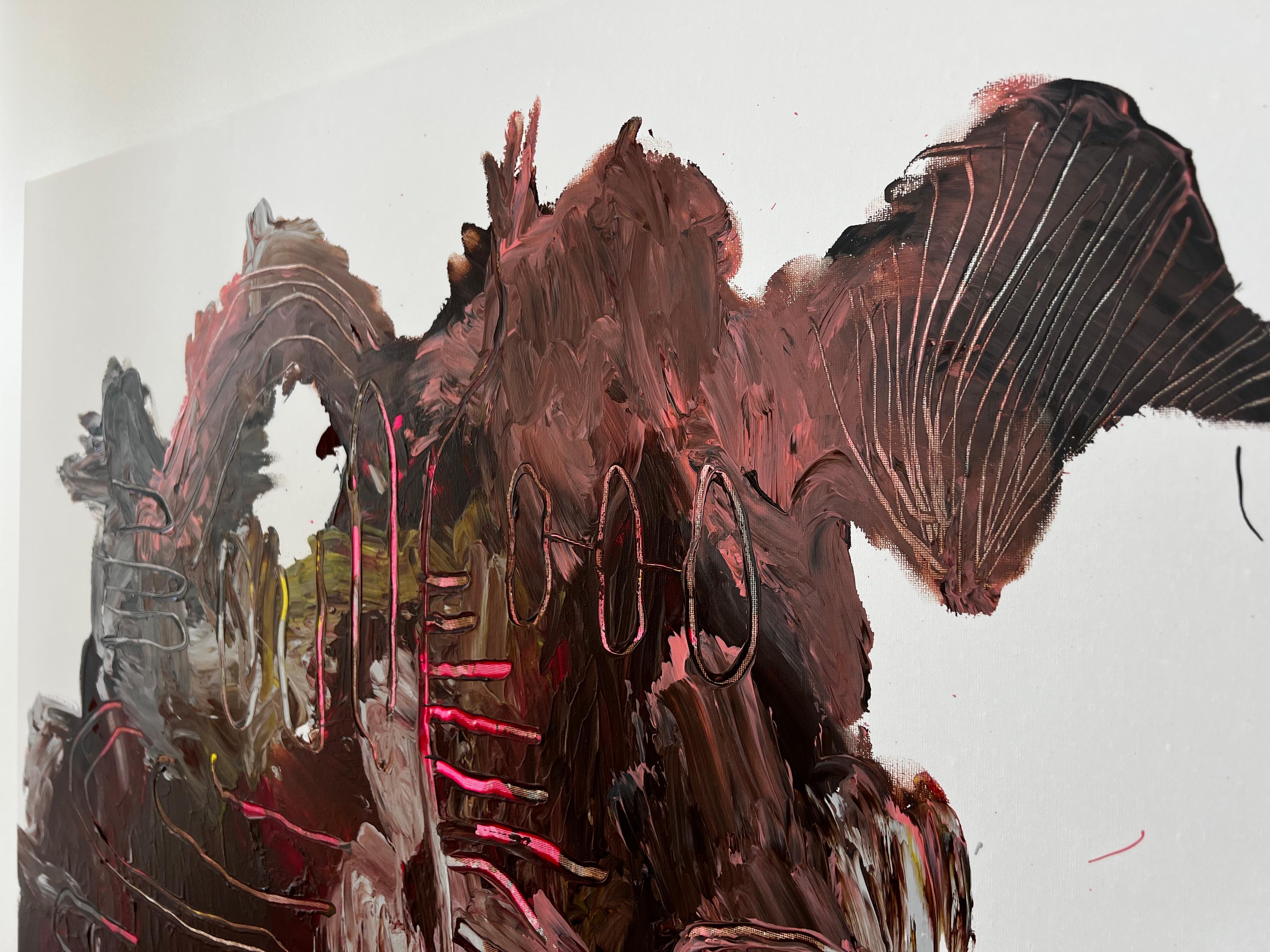 La composition se déploie en mouvements audacieux de cramoisis, de bruns terreux et de noirs profonds, contrastés par des traînées lumineuses de blanc, de rose et de jaune. Les coups de peinture sculpturaux créent une profondeur et une présence physique, tandis que les marques linéaires ajoutent une cadence presque musicale - comme des vibrations gravées dans la surface. L'effet global est à la fois puissant et poétique : une symphonie visuelle d'intensité, de fragilité et de transformation.
