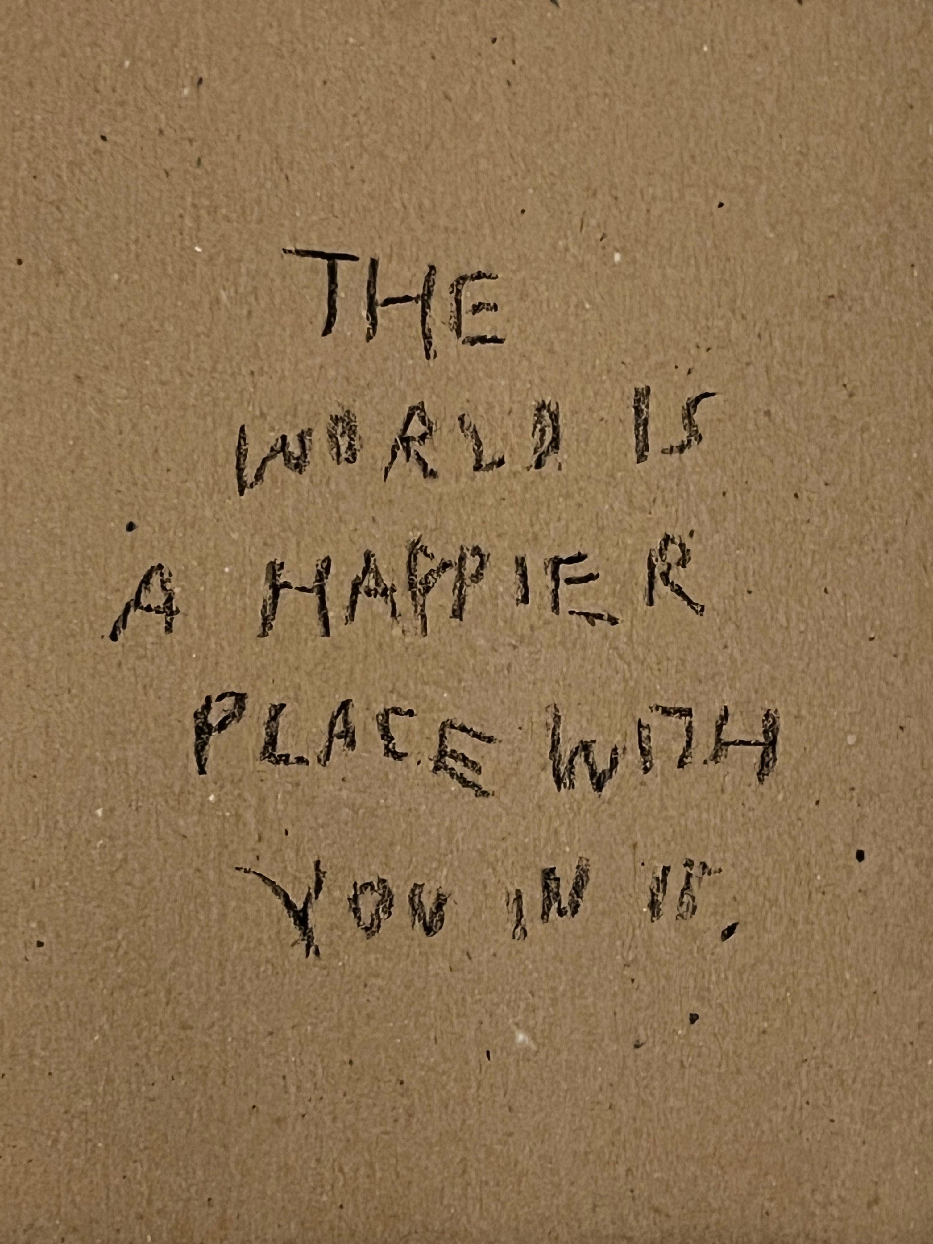 Cette œuvre intime associe un message manuscrit brut à un cadre classique en or, formant un dialogue entre tendresse et intemporalité. La phrase, gravée simplement sur la surface peinte, évoque un sentiment d'assurance tranquille - un rappel de la chaleur humaine et de l'appartenance dans un monde en mutation rapide.