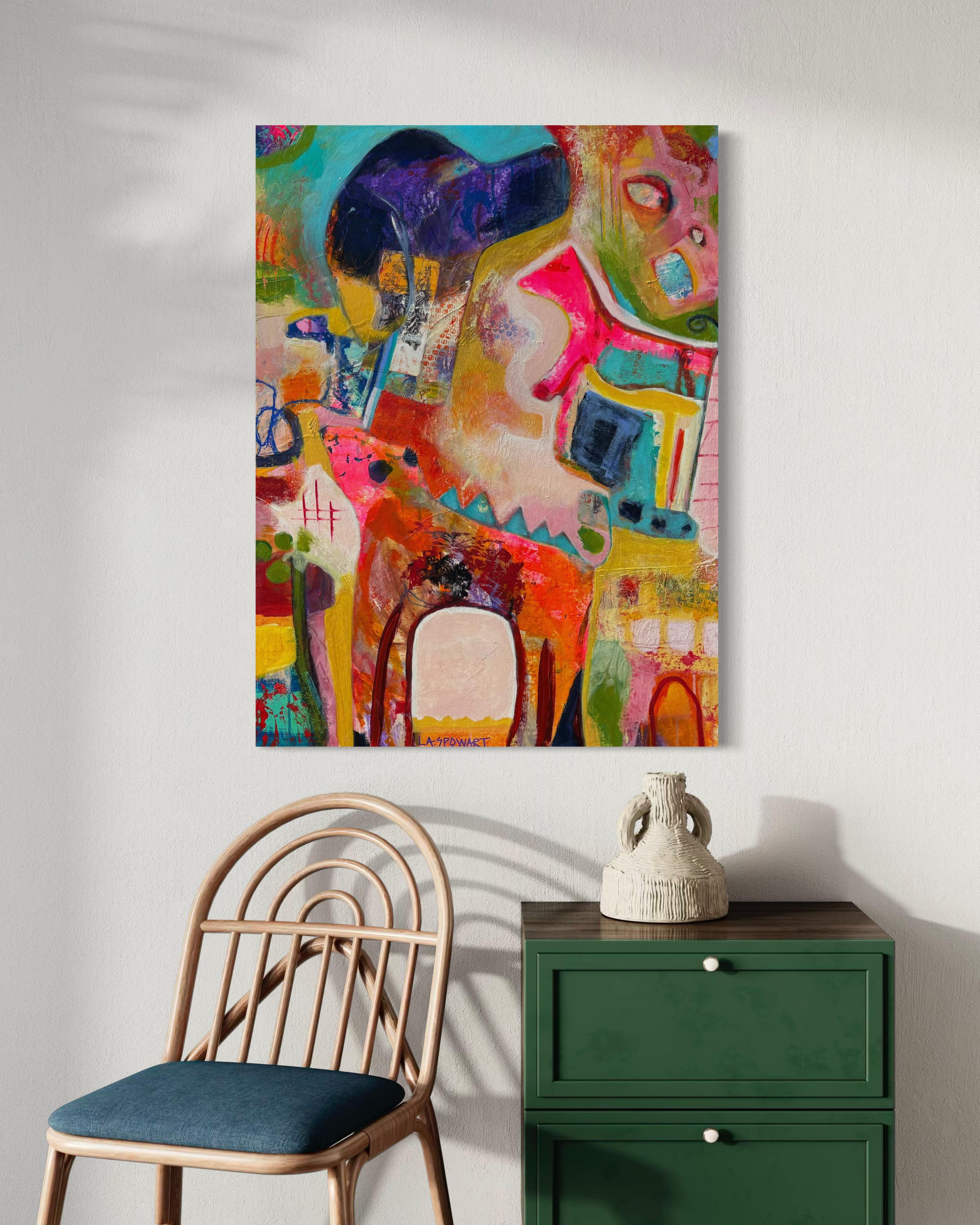 "Where the Wild Things Are" est une peinture expressionniste abstraite audacieuse et énergique, débordant de couleurs vives et de textures superposées. Des balayages de rose vif, de sarcelle, d'orange et de violet se heurtent à des marques gestuelles et à des formes ludiques, créant un paysage onirique d'imagination et de mouvement. L'œuvre illustre la capacité de Spowart à équilibrer spontanéité et structure, offrant une expérience visuelle à la fois dynamique et profondément émotive. Cette œuvre d'art contemporain originale est une pièce frappante pour les collectionneurs attirés par l'art moderne expressif.