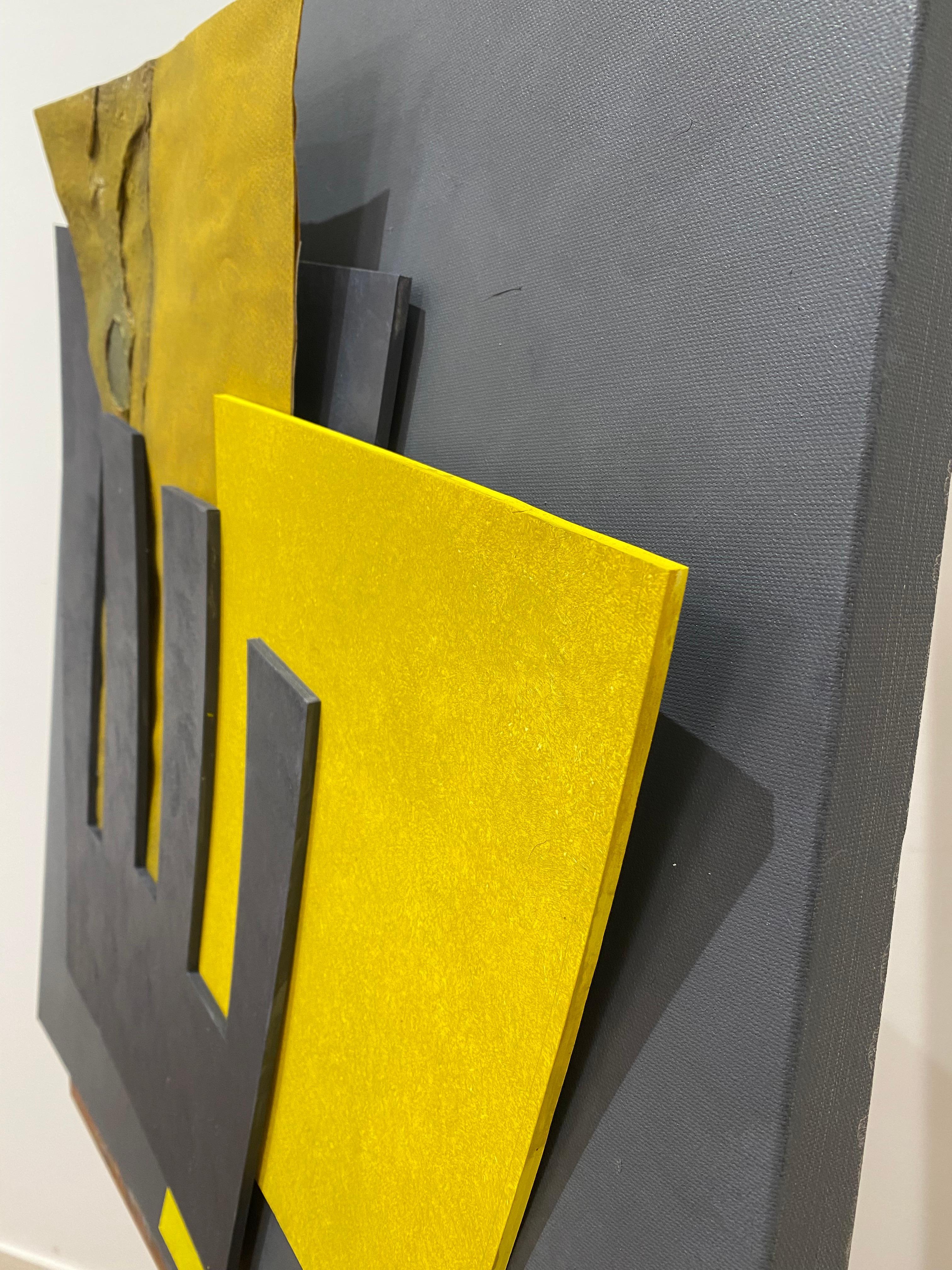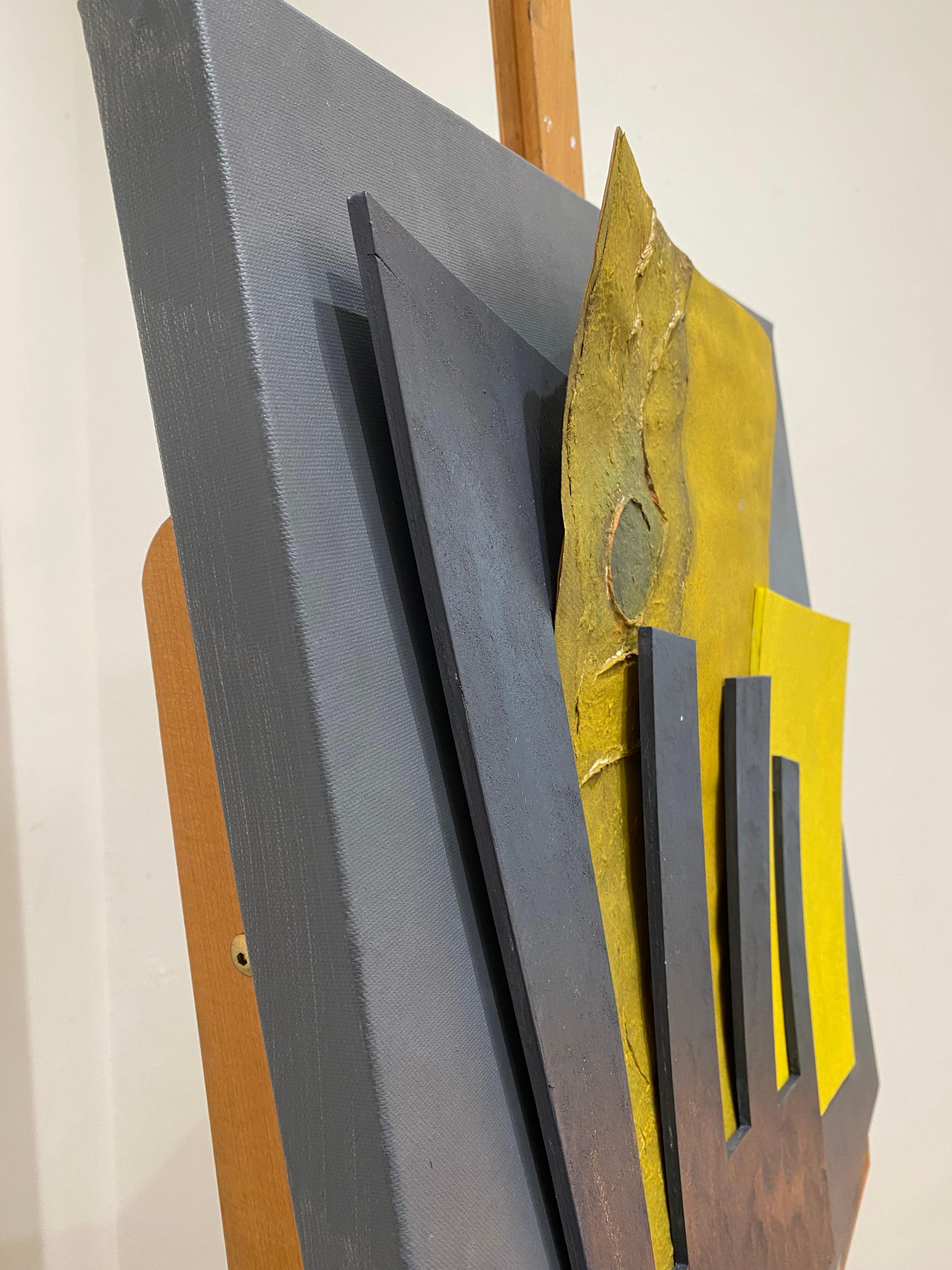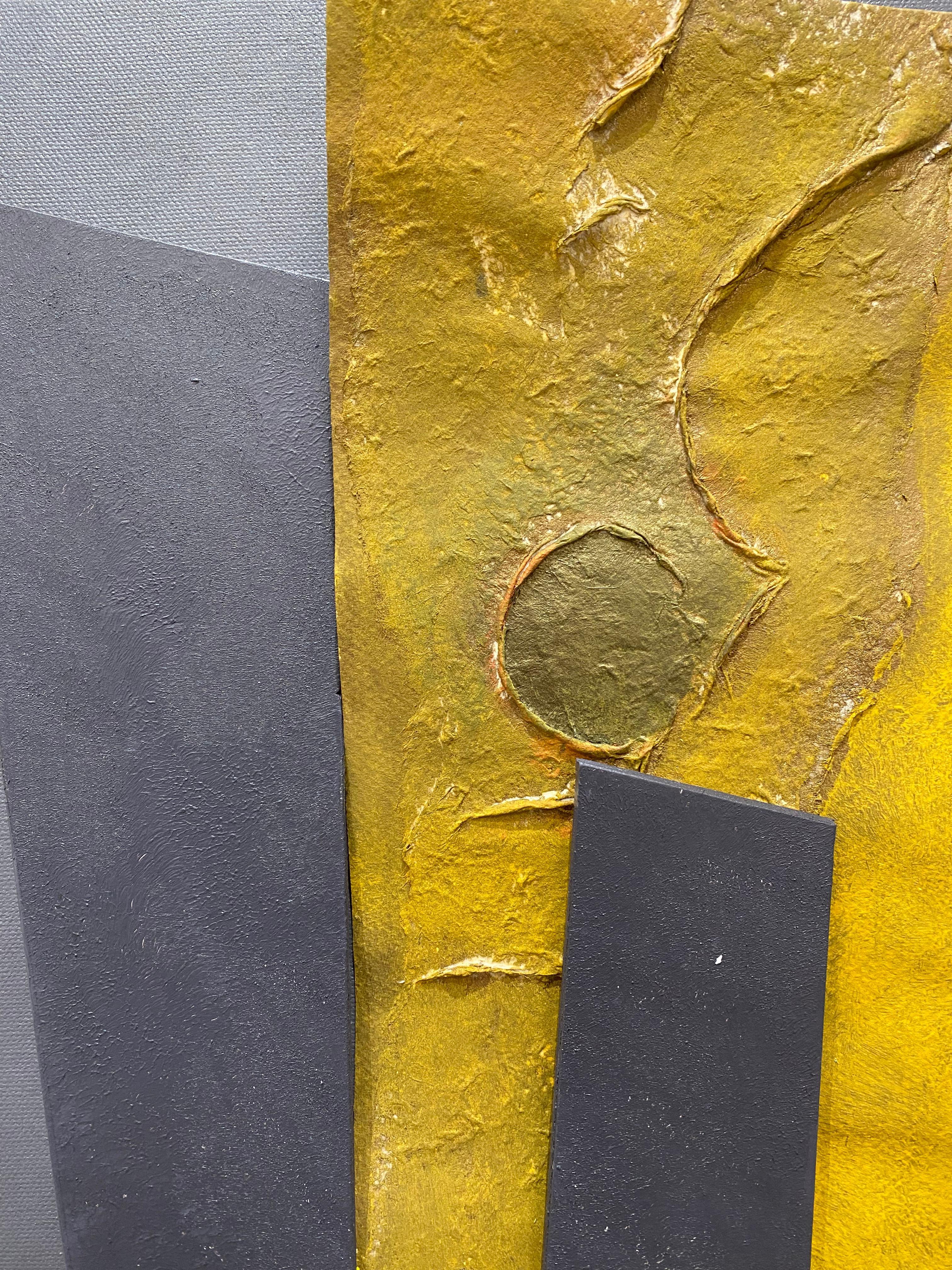 Exploration magistrale de la dimensionnalité et de la surface, cette œuvre saisissante en techniques mixtes de l'artiste italien Lucio Perna attire l'attention grâce à un jeu géométrique audacieux. Des plans d'un jaune doré éclatant s'entrecroisent avec des formes industrielles gris anthracite, créant une composition architecturale dynamique qui semble se déplacer et respirer à mesure que la lumière se déplace sur sa surface fortement texturée.