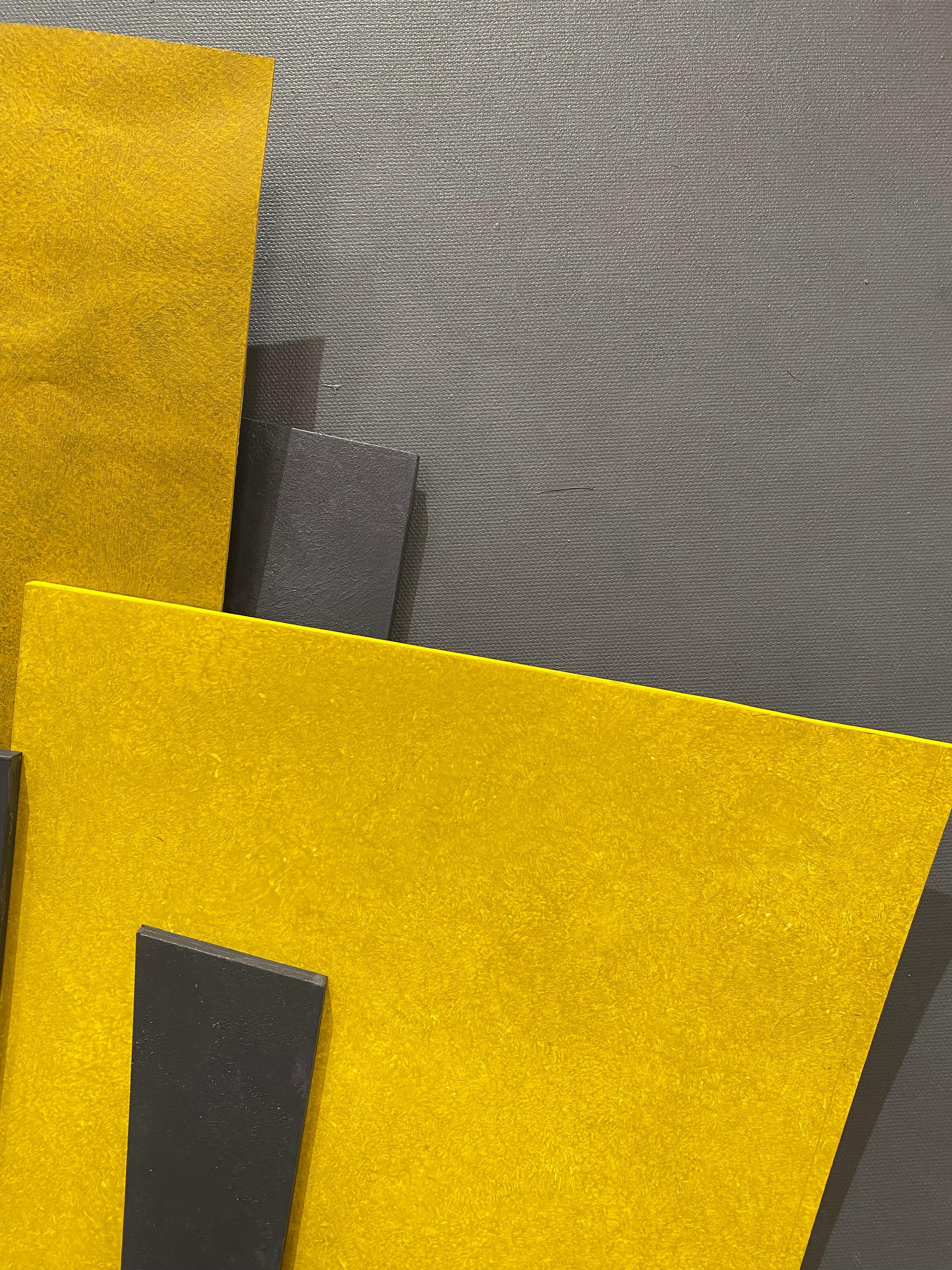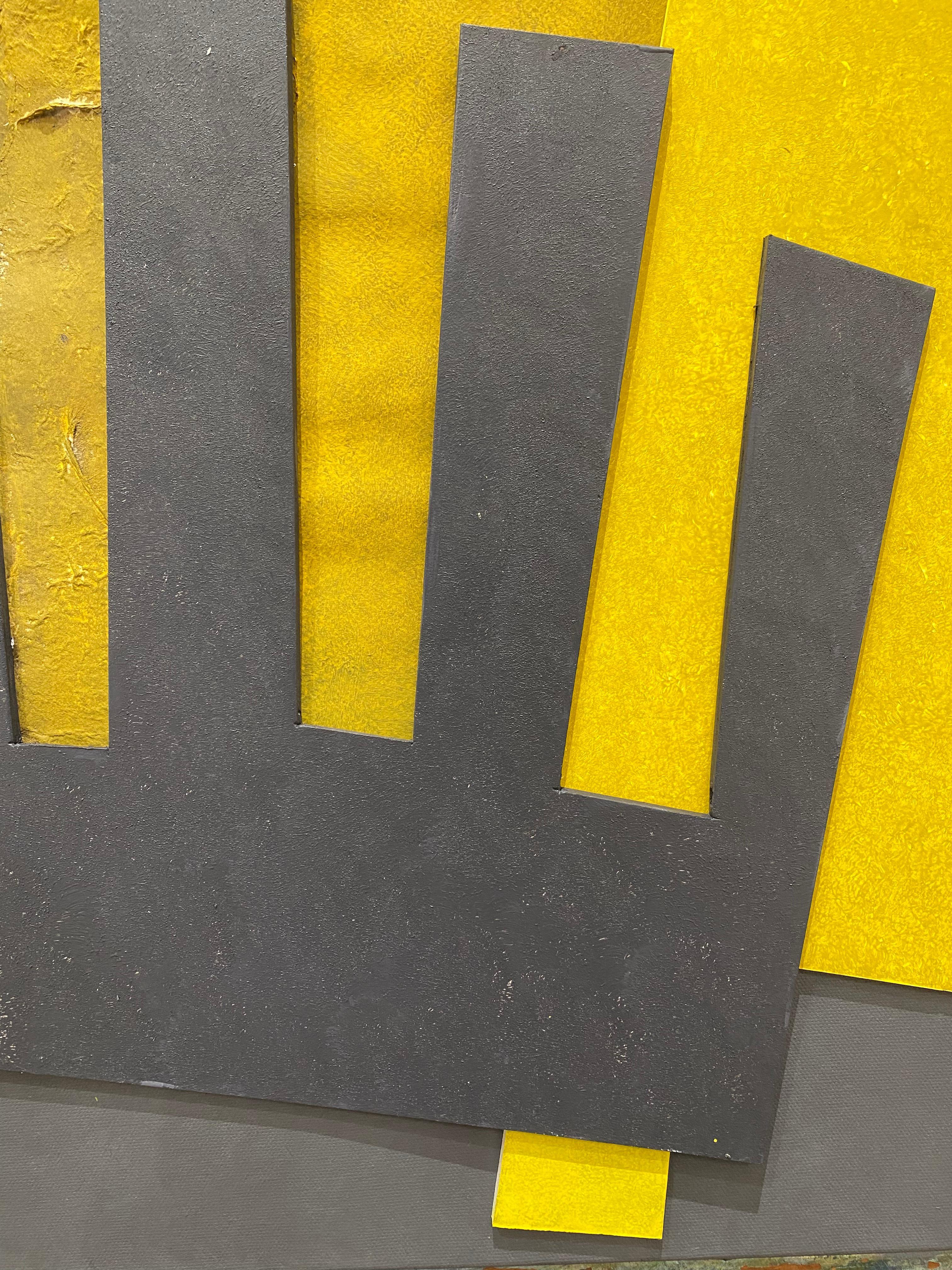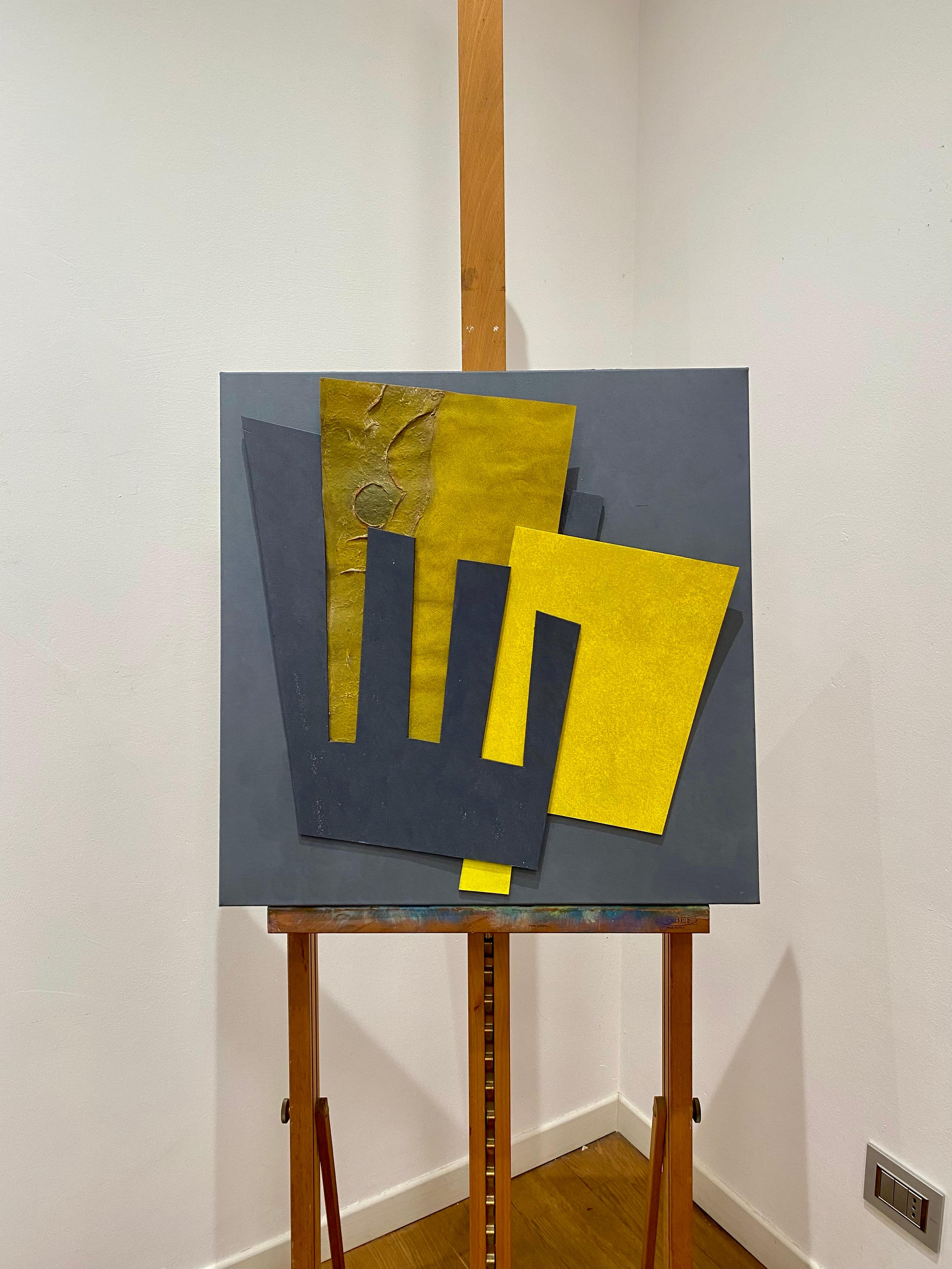 Exploration magistrale de la dimensionnalité et de la surface, cette œuvre saisissante en techniques mixtes de l'artiste italien Lucio Perna attire l'attention grâce à un jeu géométrique audacieux. Des plans d'un jaune doré éclatant s'entrecroisent avec des formes industrielles gris anthracite, créant une composition architecturale dynamique qui semble se déplacer et respirer à mesure que la lumière se déplace sur sa surface fortement texturée.