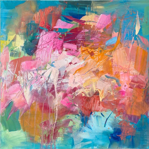 Michelle Marra, artiste, peintures abstraites en vente en ligne et dans notre galerie d'art contemporain. Je vois des bandes de couleur, de texture et de lumière. Je m'inspire du mouvement lyrique et des formes biomorphiques dans une peinture luxueuse et empâtée, tout en créant un sentiment de joie et d'esprit. Souvent, je commence un tableau par quelques prémisses, comme la couleur et les marques, afin de déterminer où je dois me concentrer ensuite. Cela permet un processus totalement libre et intuitif. J'ai repris mon pinceau pour de bon en 2010, alors que je passais plus de temps en Floride. Je travaillais à l'huile et dans le réalisme, mais je savais qu'il me manquait quelque chose. La peinture acrylique et abstraite me permet de donner une voix visuelle à mon monde intérieur et la création est devenue une partie importante de ma vie. Je me considère extrêmement chanceux de pouvoir peindre tous les jours.