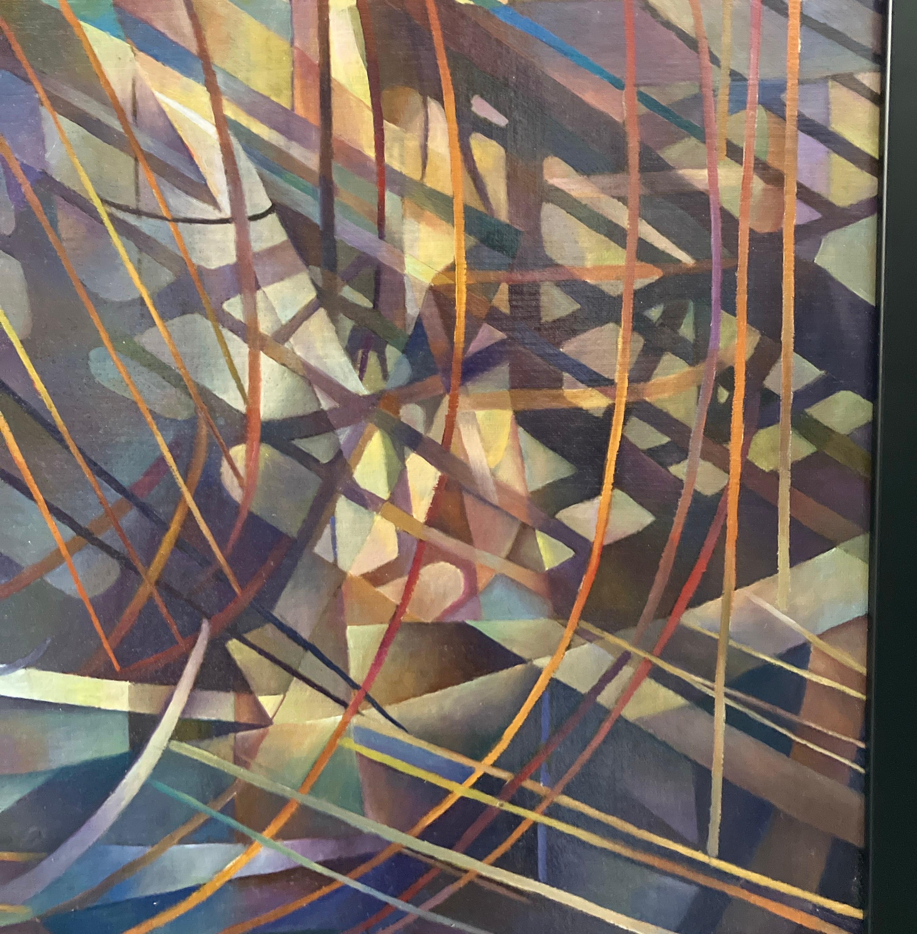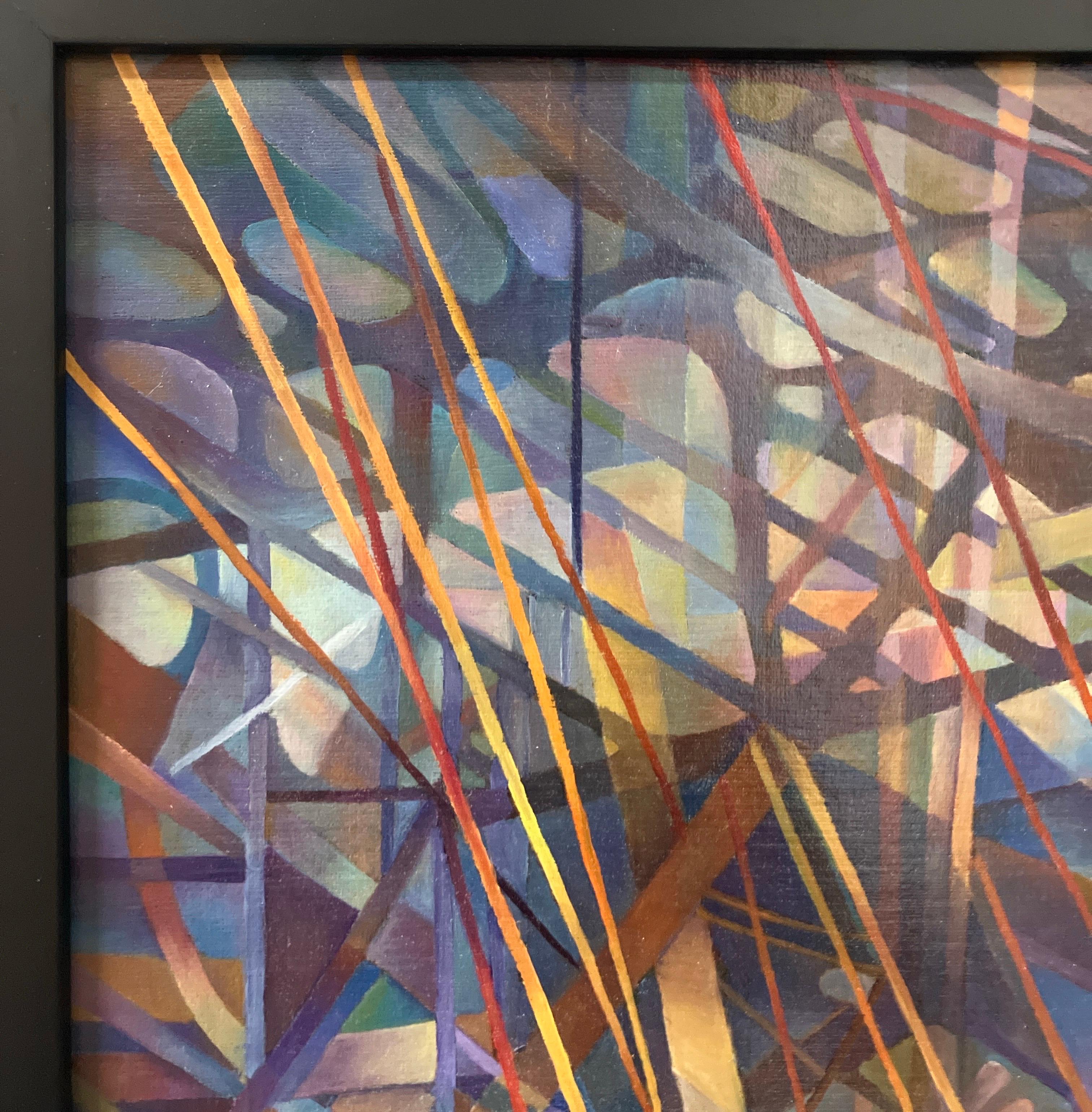 Peinture à l'huile sur massonite de Juliette Steele, abstrait géométrique, encadrée