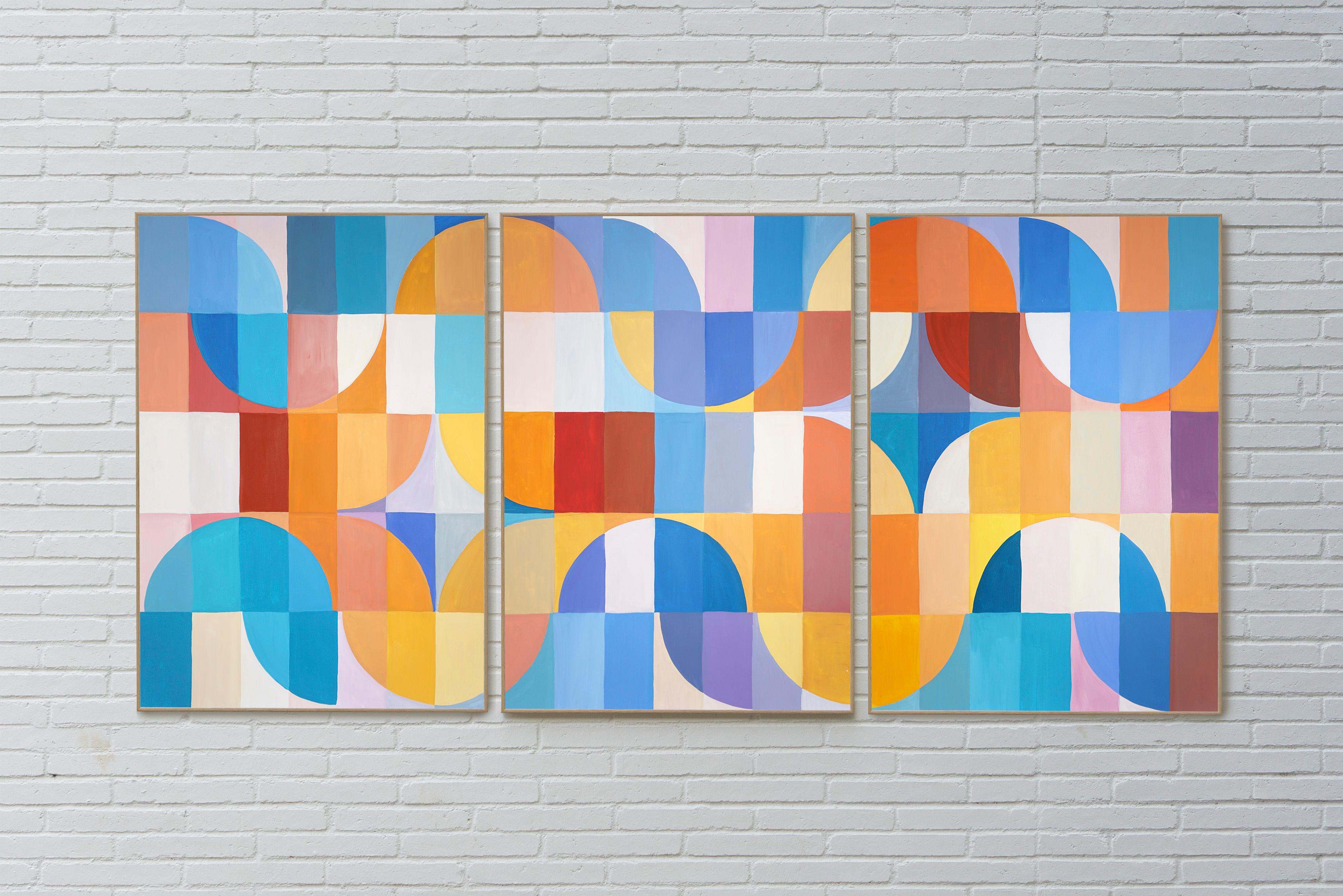 "Abstract Wavy Beach" est un triptyque saisissant qui canalise l'esprit du mouvement Bauhaus à travers une composition géométrique précise et une maîtrise magistrale de la couleur. Chaque panneau tisse des vagues et des rectangles dans une interaction harmonieuse, où les rouges audacieux, les bleus sereins, les jaunes radieux et les pastels doux créent une cadence visuelle rythmée. L'artiste fait preuve d'un talent exceptionnel pour équilibrer la palette de couleurs - en fusionnant les tons chauds et froids avec des transitions harmonieuses - ce qui donne une œuvre à la fois architecturale et lyrique.