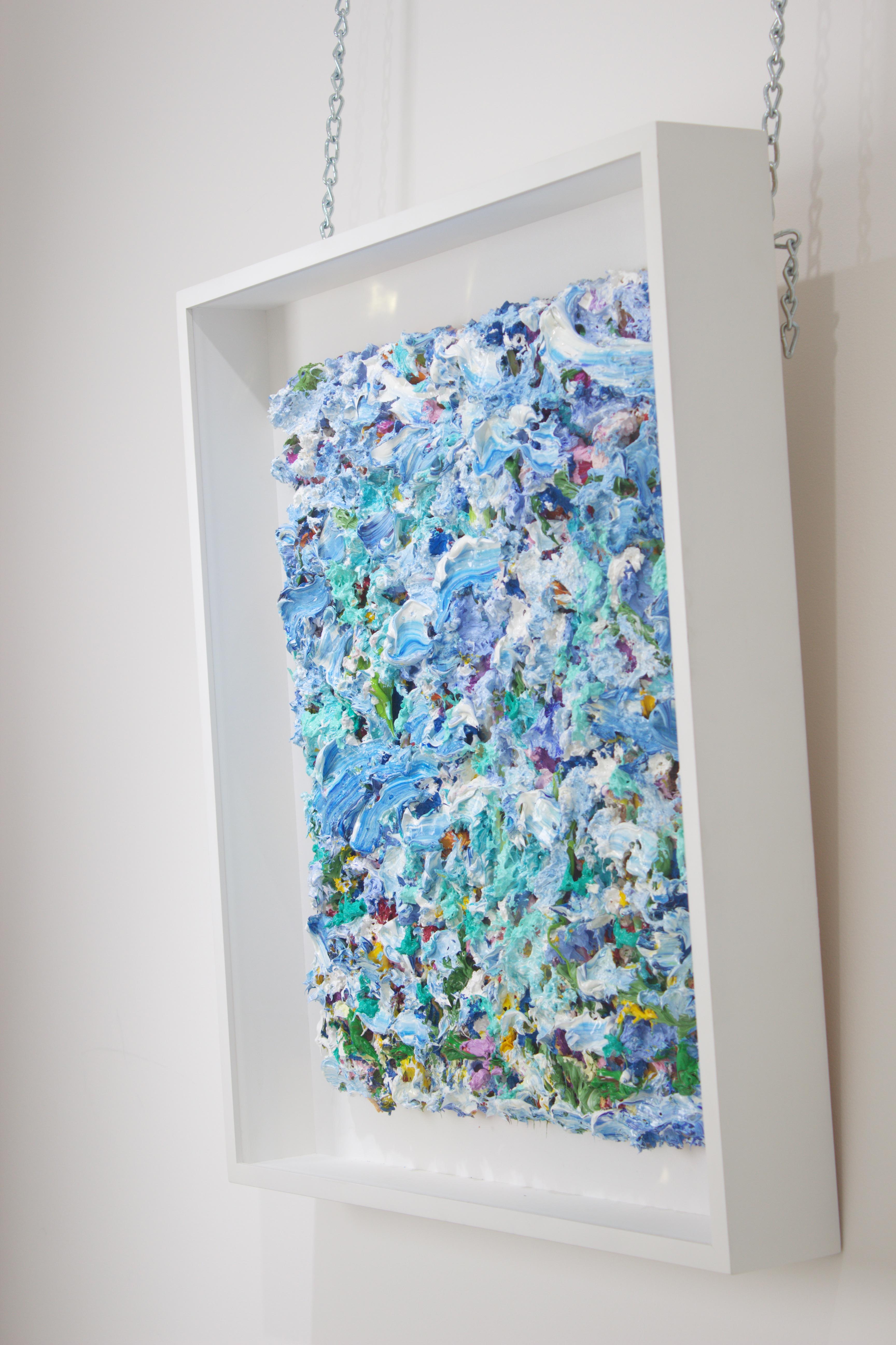 "Bleu Ciel" est une œuvre unique, qui fait partie de la série la plus récente de Courcelles, où l'acte de peindre devient sculptural. Il n'y a pas de reproduction - seulement cette rencontre singulière entre la main, la couleur et la toile. L'œuvre est signée et datée, et encadrée dans un cadre blanc profond qui souligne sa dimensionnalité tout en protégeant ses bords.