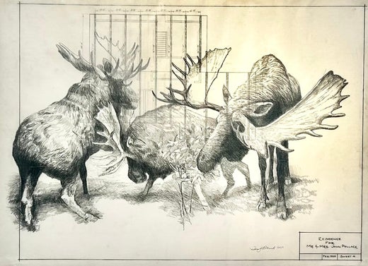 Don PollackBase calibrée et nivelée - Buffalo en graphite sur des dessins d'architecture anciens2023