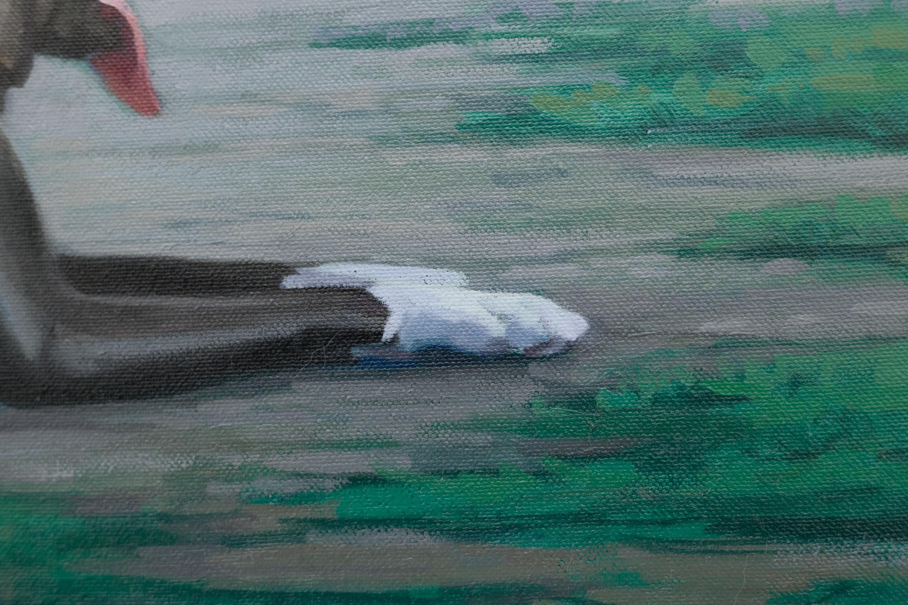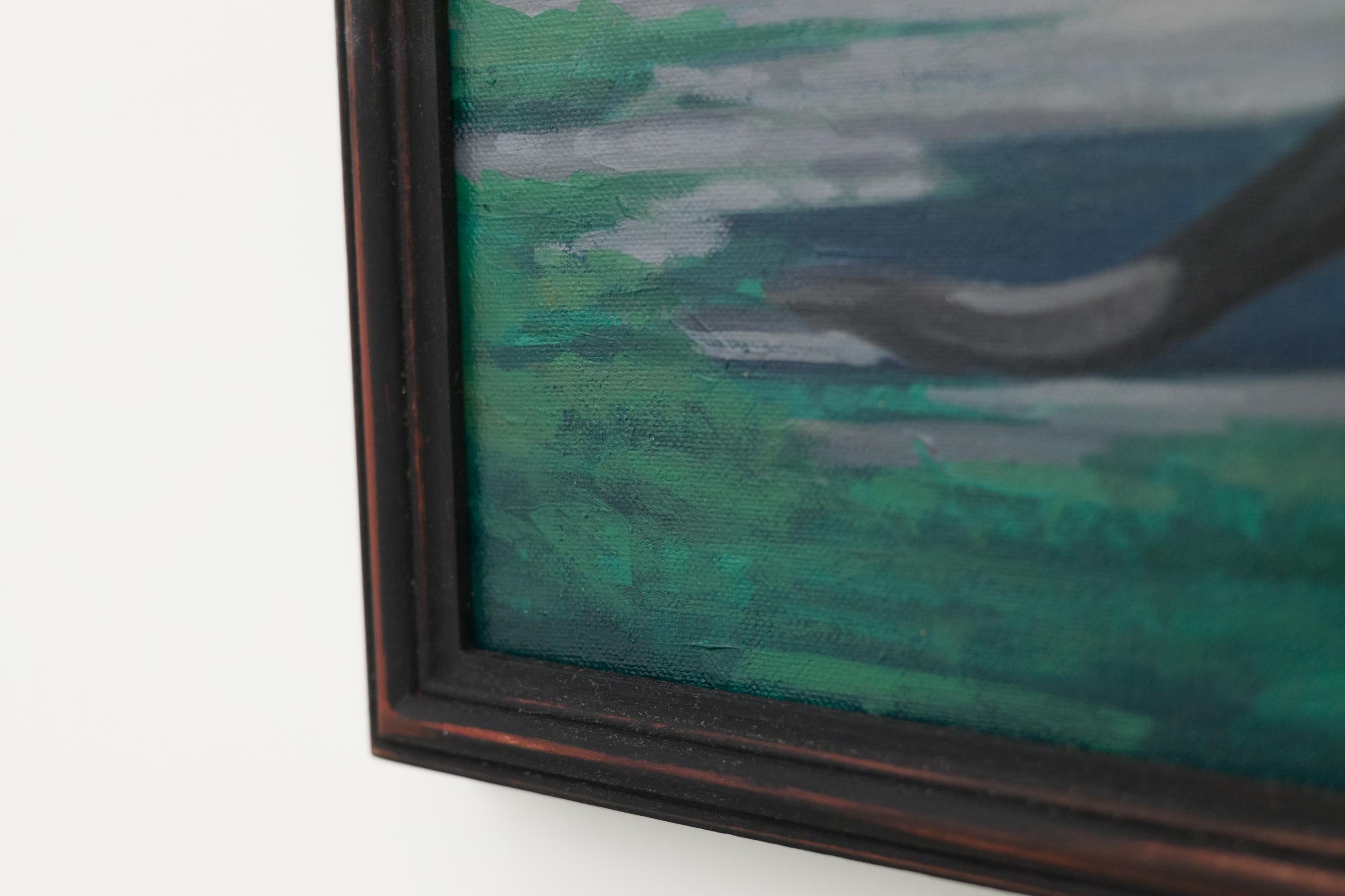Cette œuvre intitulée "Tussle" est une œuvre originale de Katherine Fraser réalisée à partir d'huile sur toile. Cette pièce mesure 16 "h x 22 "w encadrée, et est livrée avec un certi...
