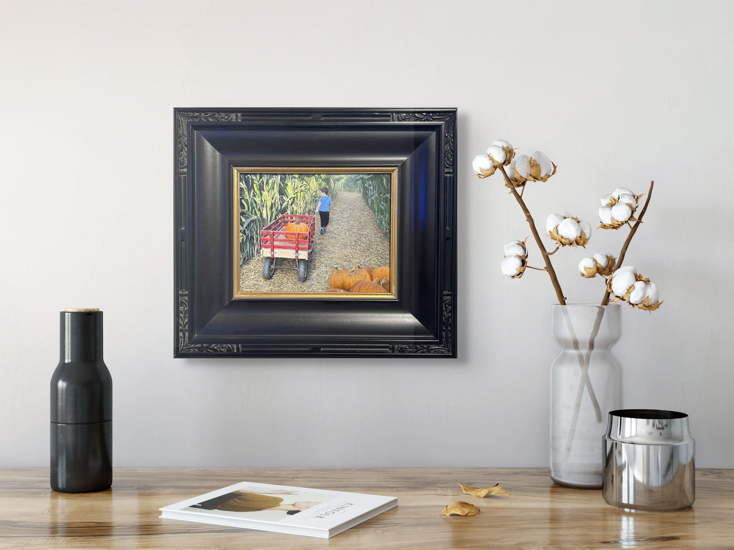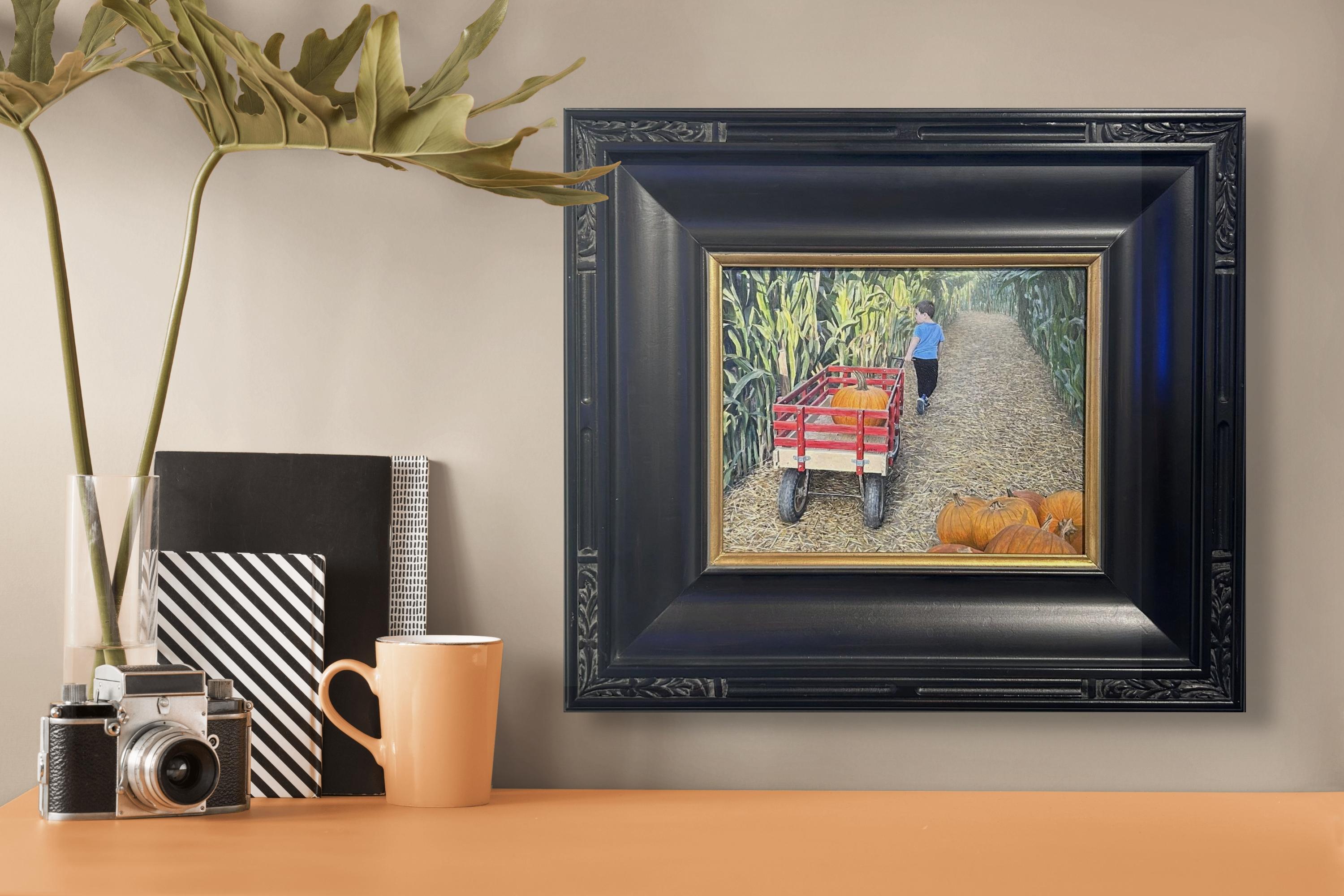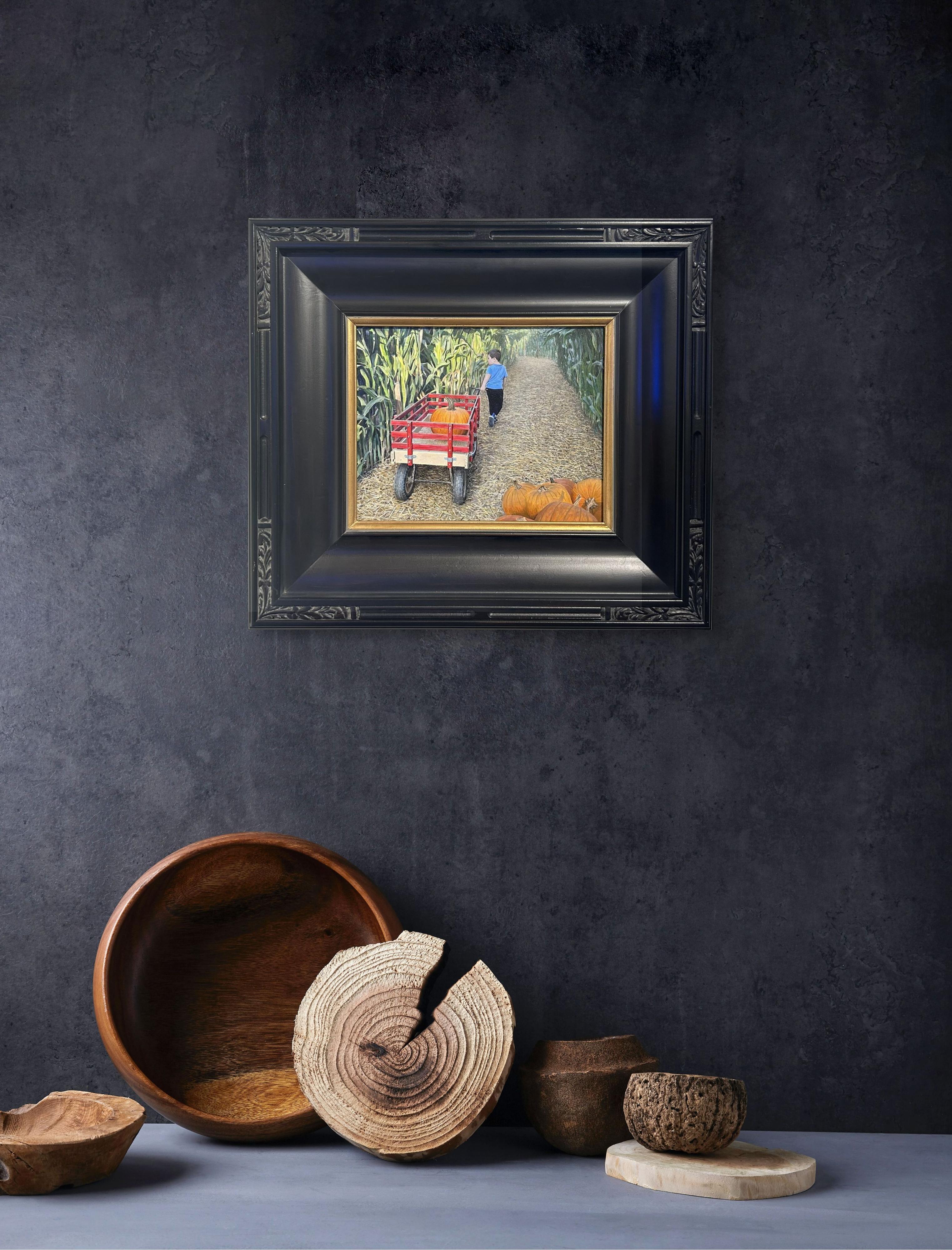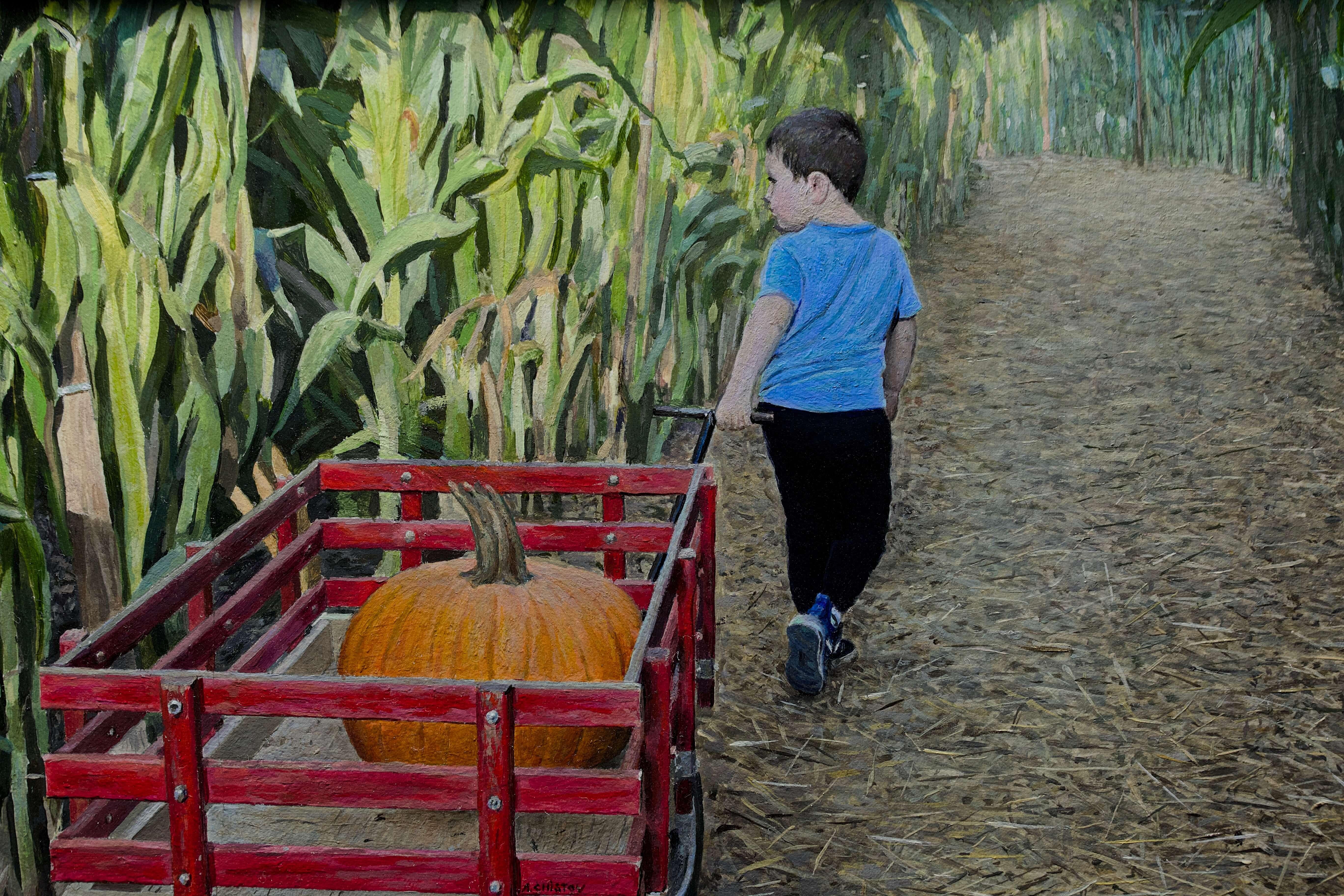 October Memories" d'Alexander Chistov est une peinture originale, faite à la main, à l'acrylique sur panneau ACM, représentant un jeune garçon tirant un chariot contenant une citrouille à travers un labyrinthe de maïs.