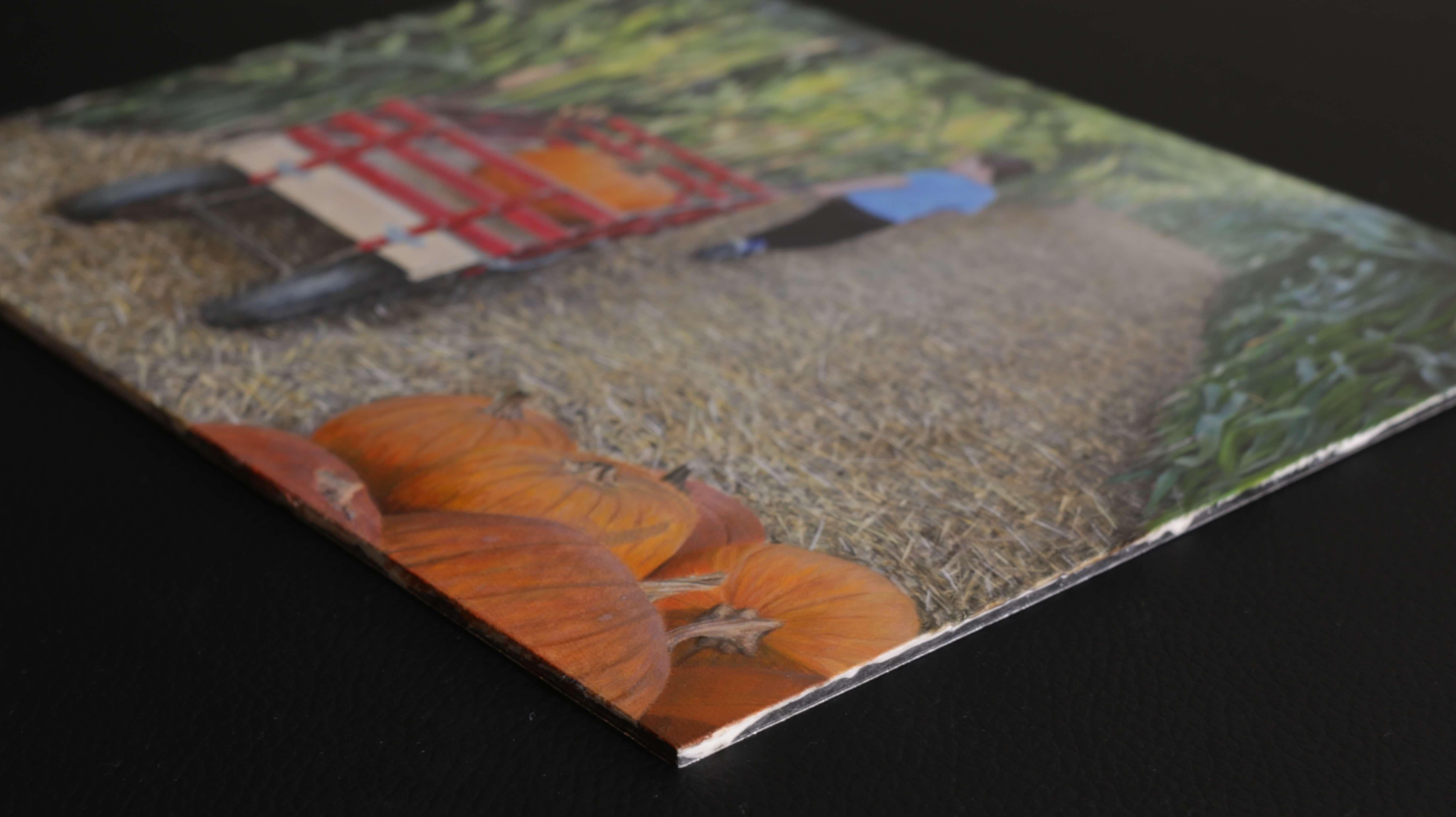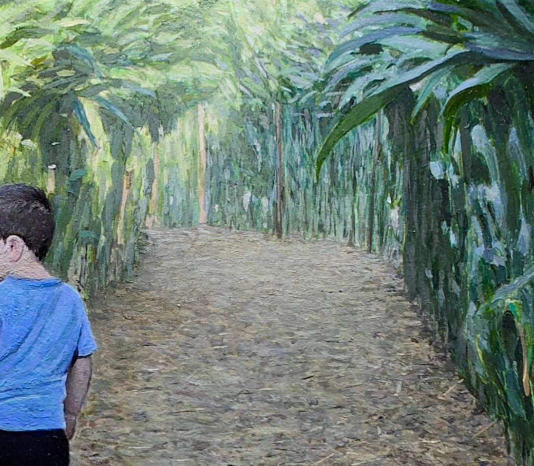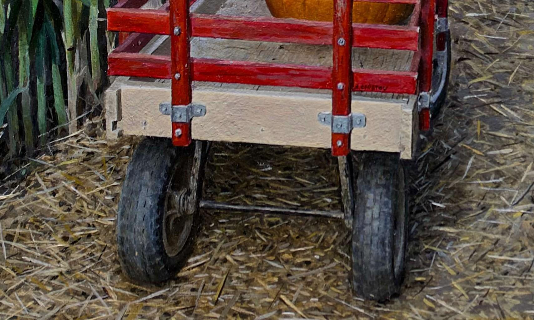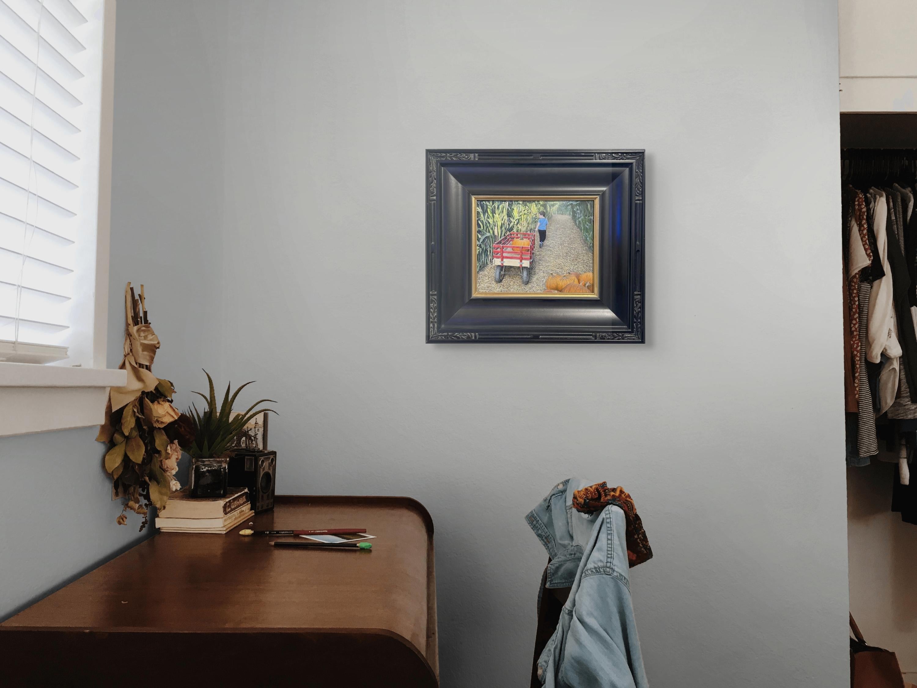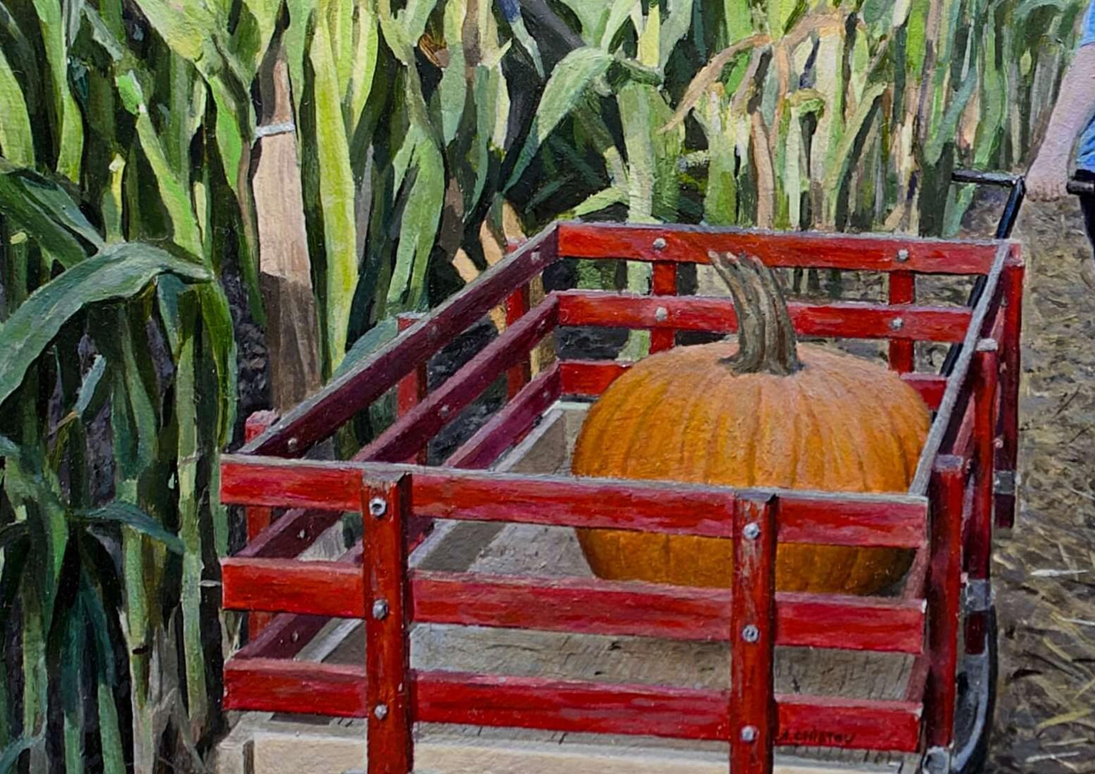 October Memories" d'Alexander Chistov est une peinture originale, faite à la main, à l'acrylique sur panneau ACM, représentant un jeune garçon tirant un chariot contenant une citrouille à travers un labyrinthe de maïs.